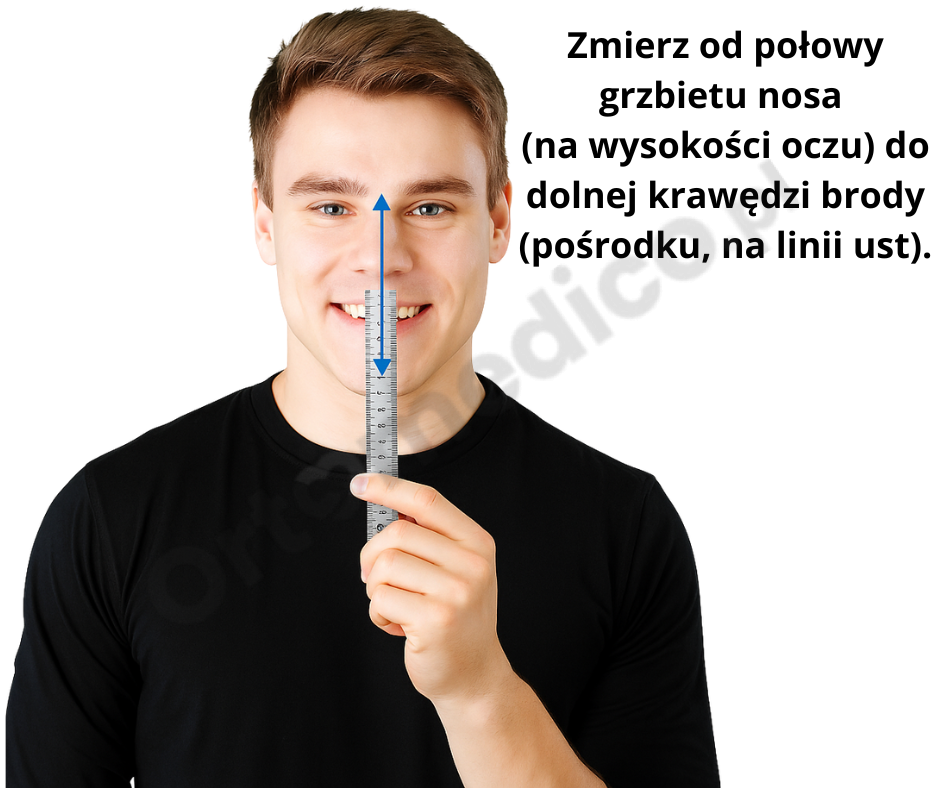 ? Od połowy grzbietu nosa (na wysokości oczu) do dolnej krawędzi brody (pośrodku, na linii ust).