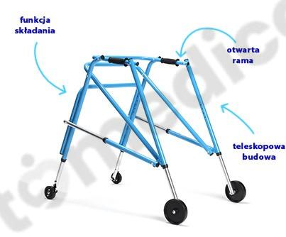 Bezpieczeństwo: Automatyczny mechanizm blokady kół tylnych zapobiega niekontrolowanemu przesuwaniu się balkonika do tyłu, co minimalizuje ryzyko upadku, gdy dziecko straci równowagę.