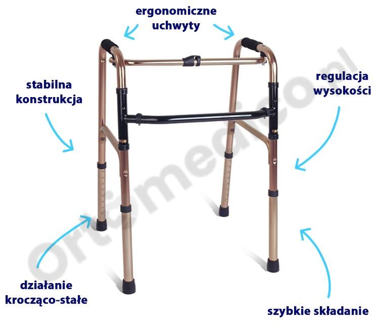 - Mechanizm "kroczący" pozwala na przesuwanie balkonika na zmianę z ruchem nóg, co ułatwia poruszanie się.