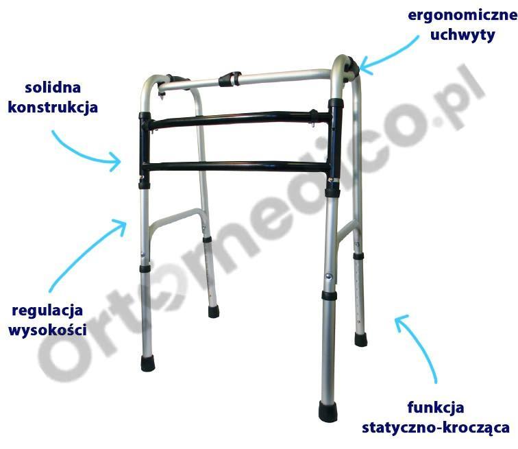 - Mechanizm "kroczący" pozwala na przesuwanie balkonika na zmianę z ruchem nóg, co ułatwia poruszanie się.