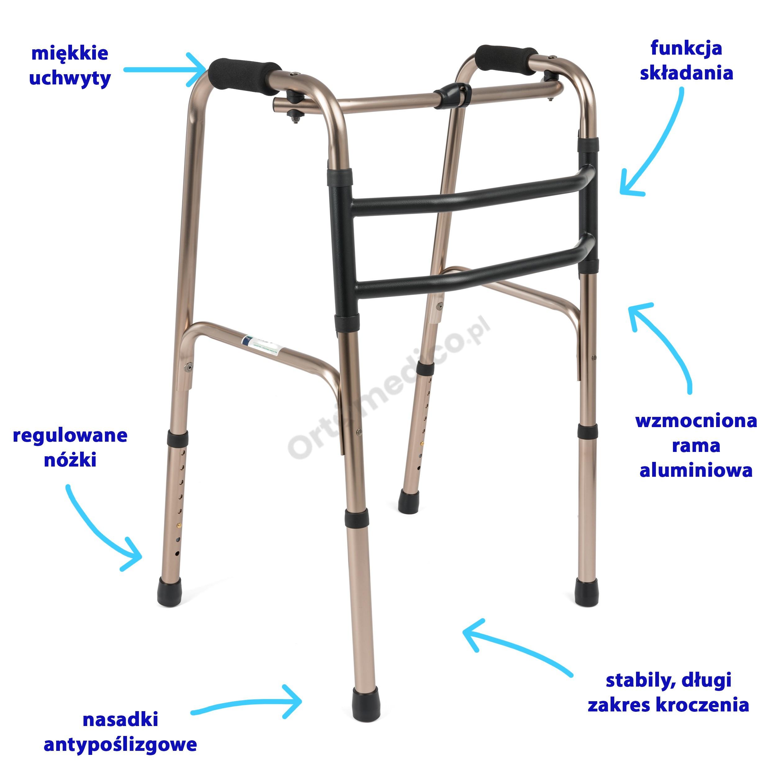 - Mechanizm "kroczący" pozwala na przesuwanie balkonika na zmianę z ruchem nóg, co ułatwia poruszanie się.