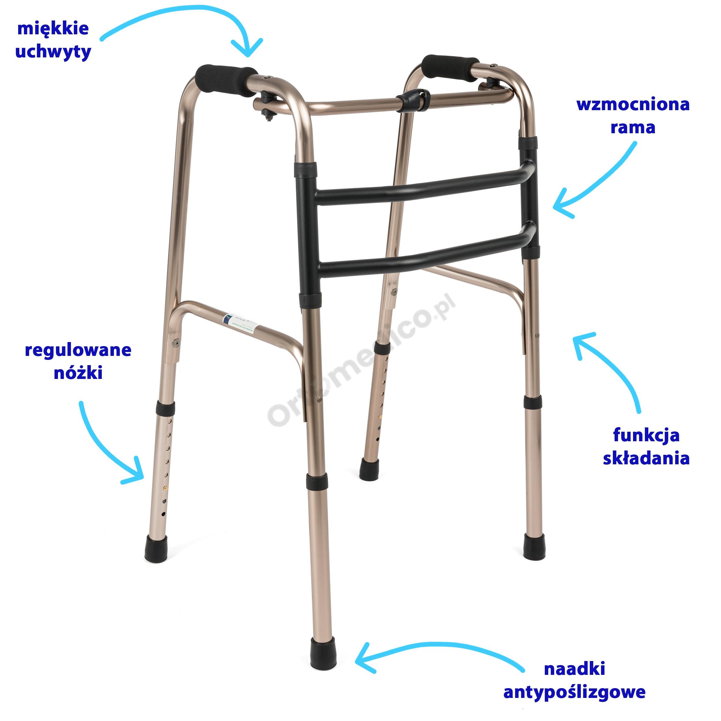 • Mechanizm "kroczący" pozwala na przesuwanie balkonika na zmianę z ruchem nóg, co ułatwia poruszanie się.