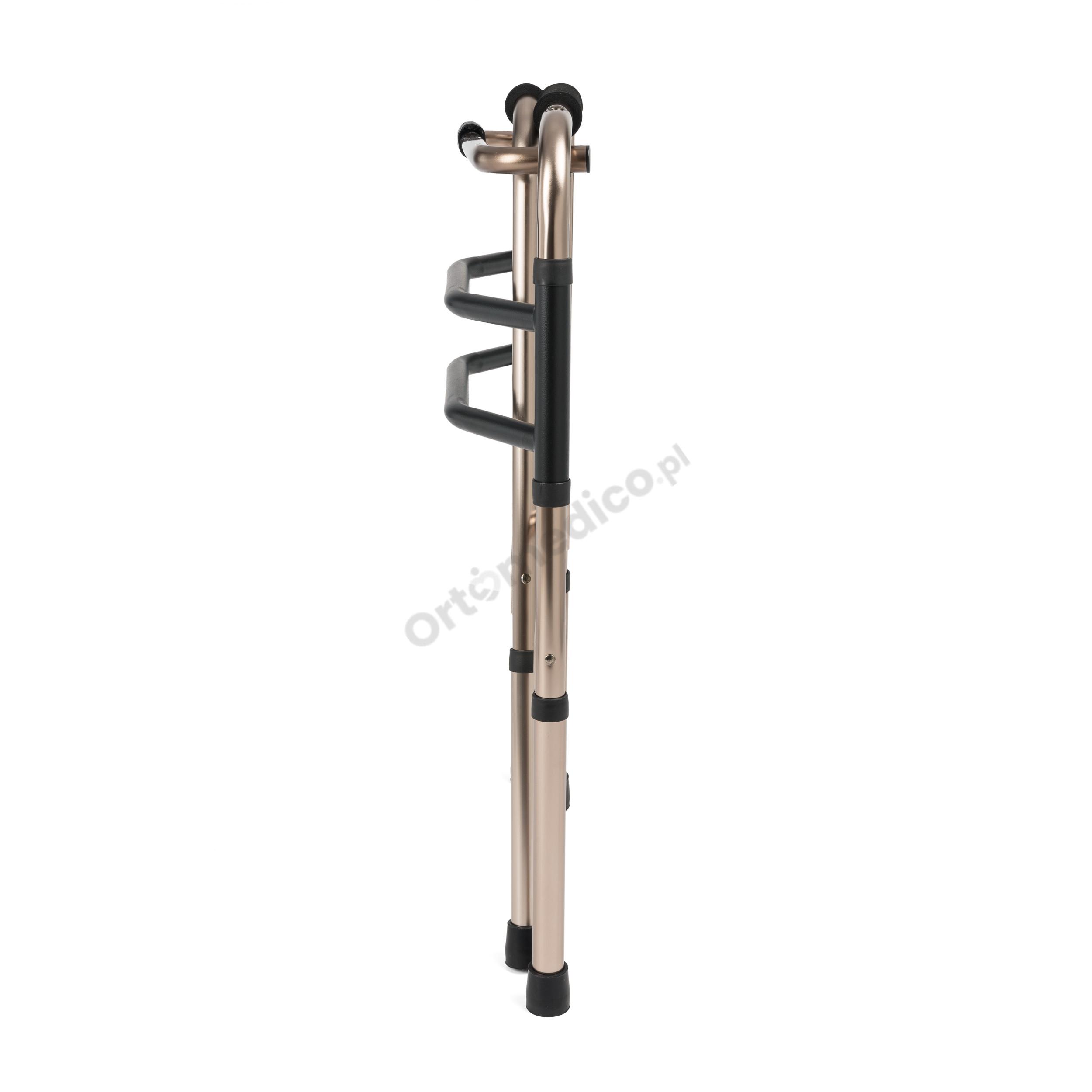 Model JMC-C 3201 Timago to składany balkonik statyczny w eleganckim, miedzianym kolorze, zaprojektowany specjalnie dla osób z ograniczoną sprawnością ruchową. Jest idealnym wsparciem dla seniorów oraz osób potrzebujących stabilizacji i asekuracji podczas chodzenia. Balkonik ten pomaga w utrzymaniu równowagi, poprawia komfort poruszania się oraz zwiększa bezpieczeństwo, redukując ryzyko upadków. Jest szczególnie polecany osobom z problemami kończyn dolnych, wspierając ich w powrocie do aktywności oraz ułatwiając poruszanie się i pionizację.