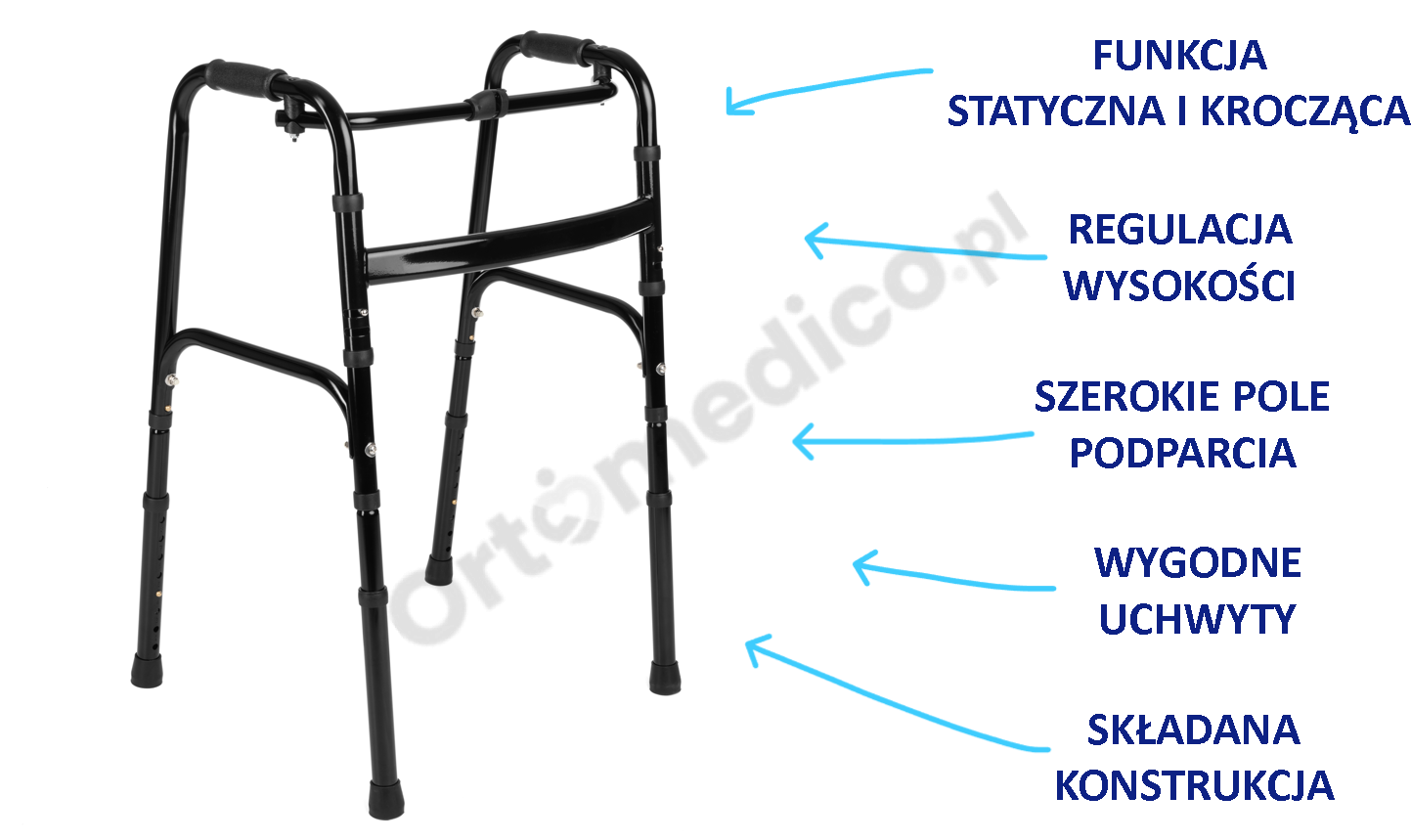 - Mechanizm "kroczący" pozwala na przesuwanie balkonika na zmianę z ruchem nóg, co ułatwia poruszanie się.