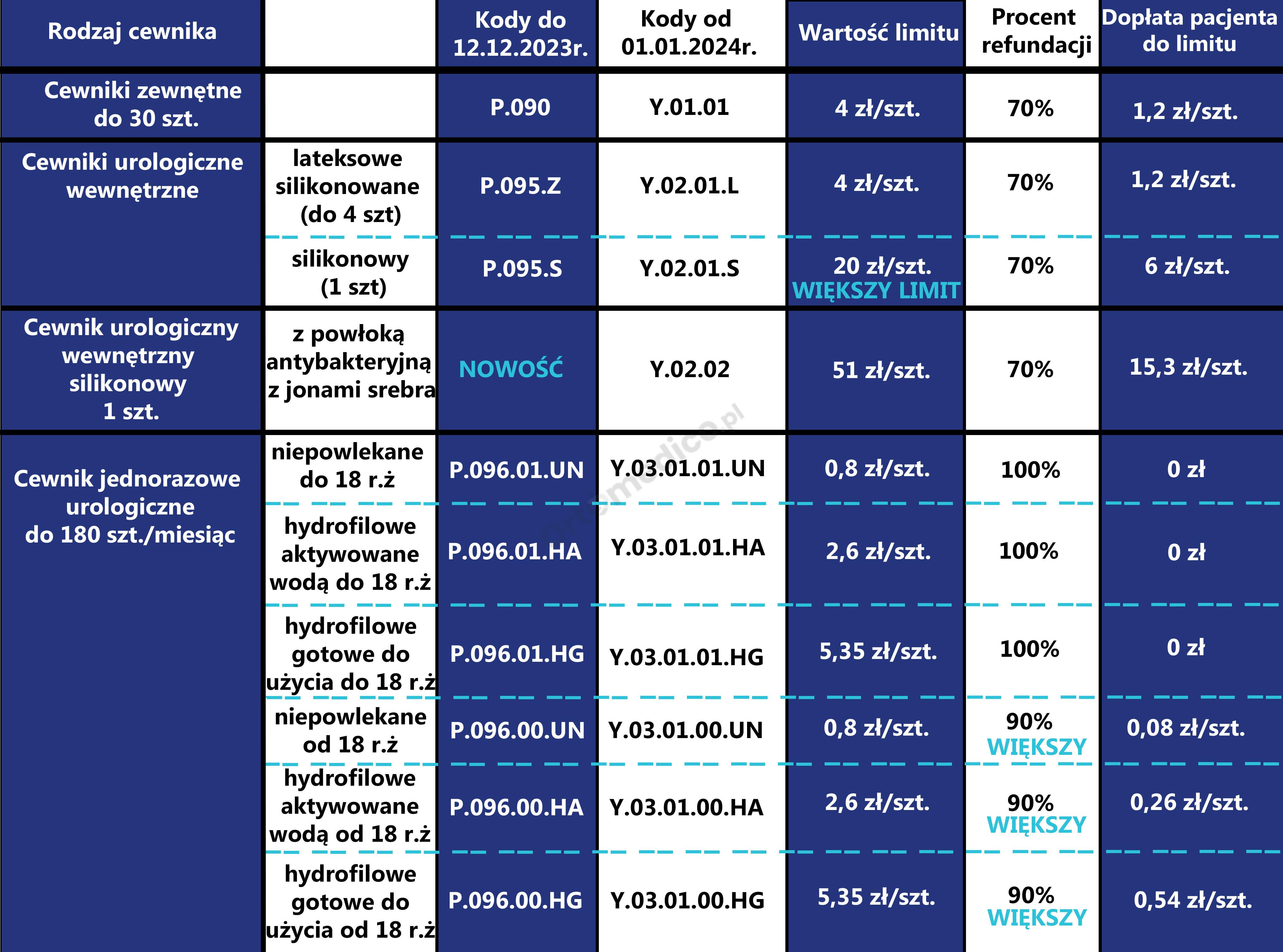 Od 1 stycznia 2024 roku zostanie zwiększona wysokość refundacji na wyroby chłonne. Dotychczas refundacja wynosiła 70% z limitu finansowania. Od nowego roku refundacja zostanie zwiększona oraz podzielona na dwie grupy osób: 80% refundacji w przypadku osób dorosłych oraz 90% w przypadku dzieci do 18 roku życia. Limity finansowania pozostają bez zmian.
