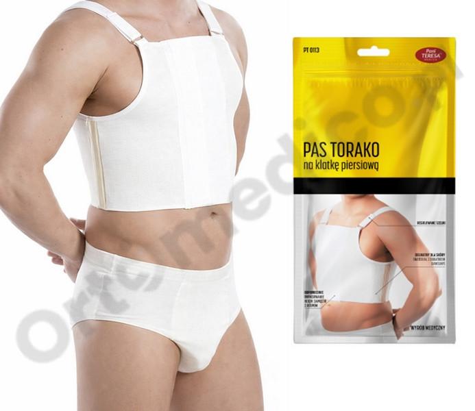 Pas torako dla mężczyzn Pani Teresa PT0113 to wyrób medyczny wielokrotnego użytku, przeznaczony do stabilizacji klatki piersiowej u mężczyzn po zabiegach operacyjnych, urazach oraz w trakcie leczenia i rehabilitacji. Produkt zapewnia kontrolowany ucisk, ogranicza nadmierne ruchy klatki piersiowej i wspiera proces gojenia po operacjach kardiochirurgicznych, torakochirurgicznych oraz po złamaniach mostka i żeber. Konstrukcja pasa została zaprojektowana z myślą o męskiej anatomii, umożliwiając skuteczną stabilizację klatki piersiowej bez ograniczania codziennego funkcjonowania.