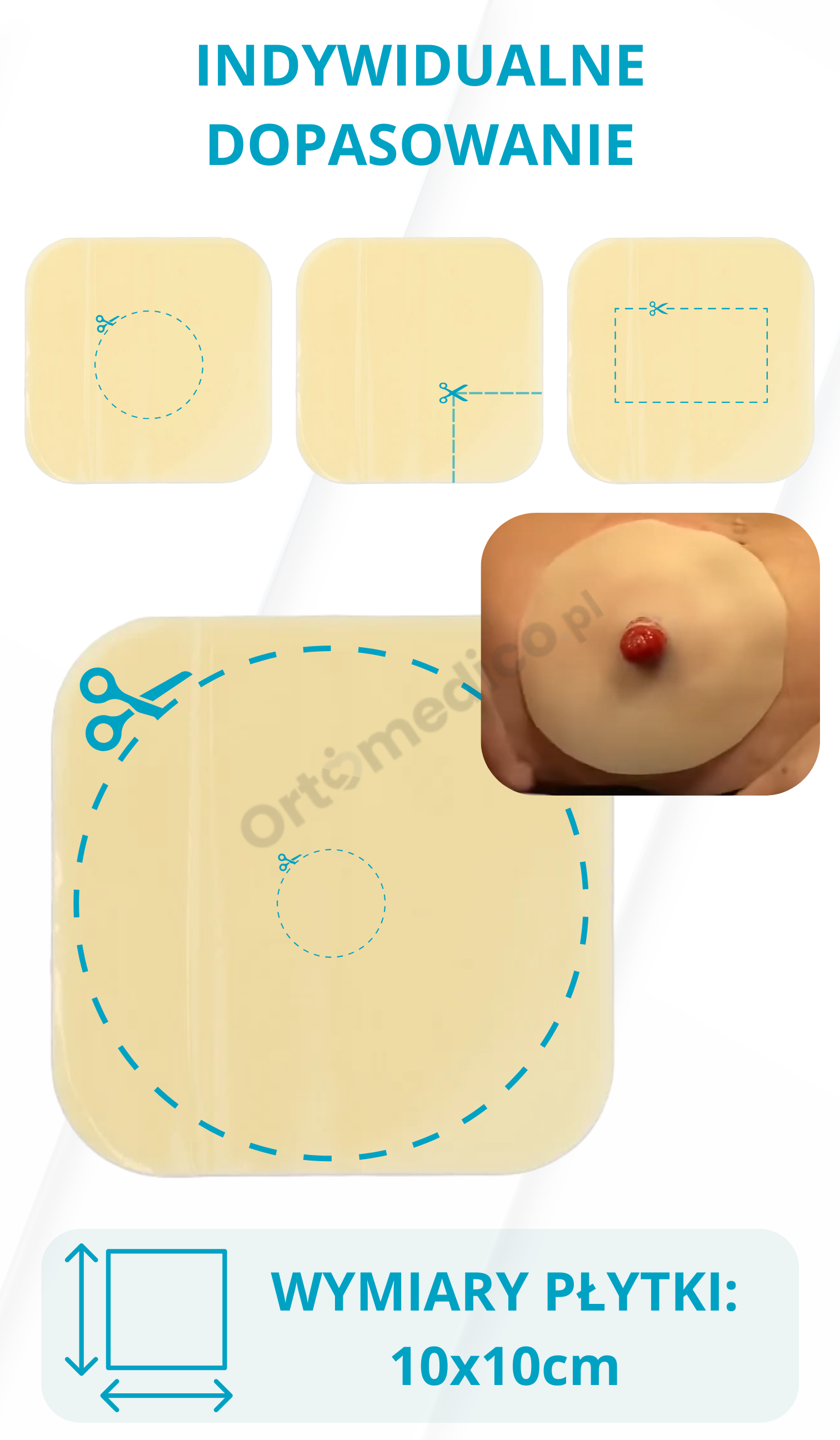 Wersja 10×10 cm może być łatwo przycięta do dowolnego kształtu, co pozwala idealnie dopasować płytkę do konkretnej lokalizacji stomii i budowy anatomicznej użytkownika. To zapewnia nie tylko wygodę, ale także skuteczność ochrony.