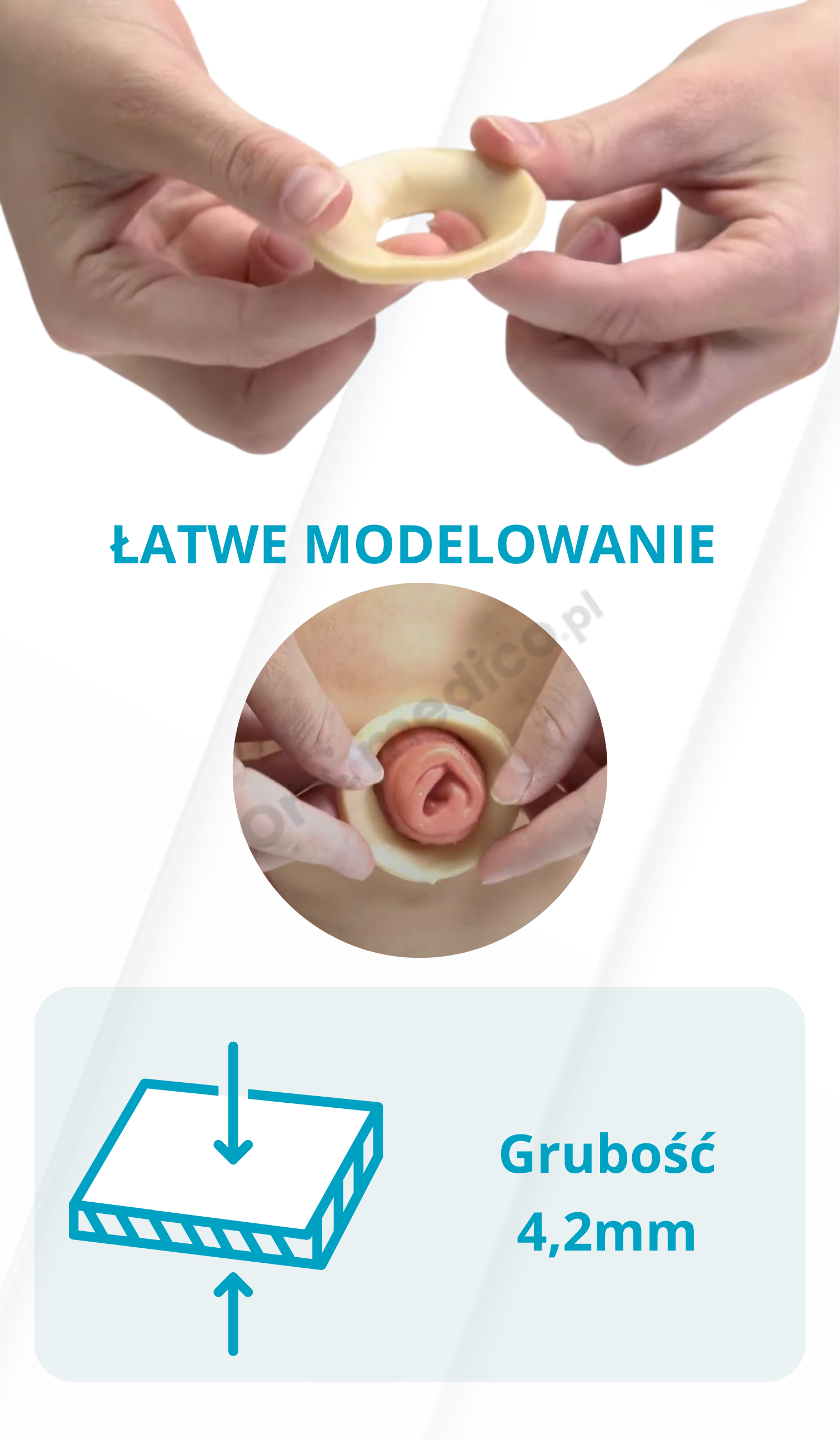 Wyrób jest formowalny – można go łatwo modelować, ugniatać, rozciągać i dopasowywać do indywidualnych cech stomii: jej kształtu, wielkości i głębokości. To idealne rozwiązanie zarówno dla osób z wypukłą, jak i wklęsłą stomią.