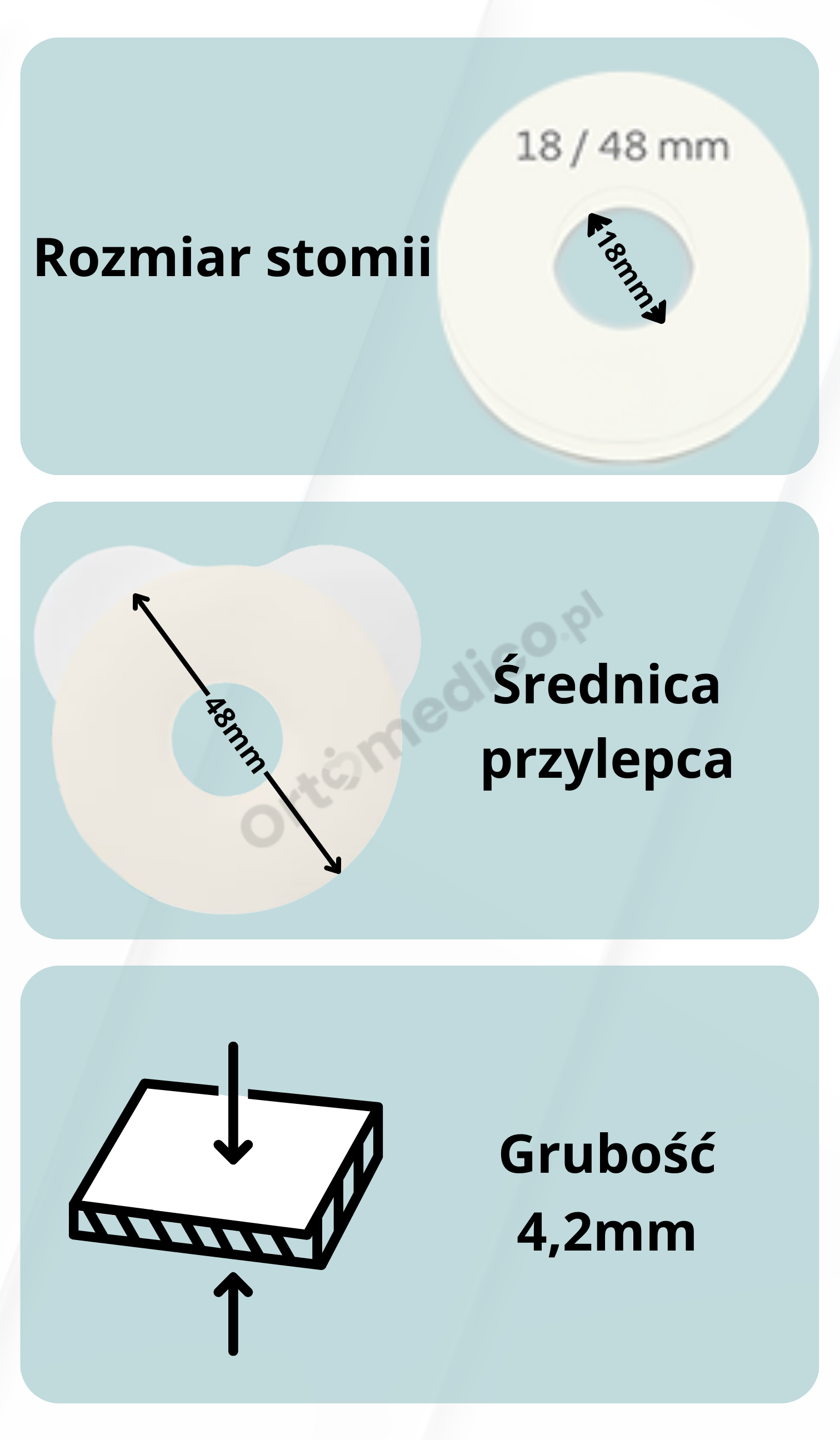 Wariant o średnicy 18 mm i grubości 4,2 mm to idealne rozwiązanie dla osób potrzebujących precyzyjnego dopasowania oraz wyjątkowo szczelnego zabezpieczenia – zwłaszcza w przypadku trudnych warunków anatomicznych, po operacjach przepukliny lub zabiegach jelitowo-brzusznych.