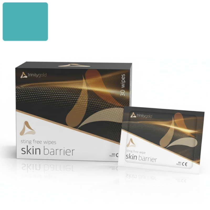 Trinity Gold TR303 to wysokiej jakości silikonowa chusteczka ochronna do skóry, przeznaczona do codziennej pielęgnacji skóry wokół stomii. Produkt tworzy cienką, oddychającą warstwę ochronną, która skutecznie zabezpiecza skórę przed wilgocią, działaniem przylepców stomijnych oraz enzymów zawartych w treści jelitowej.