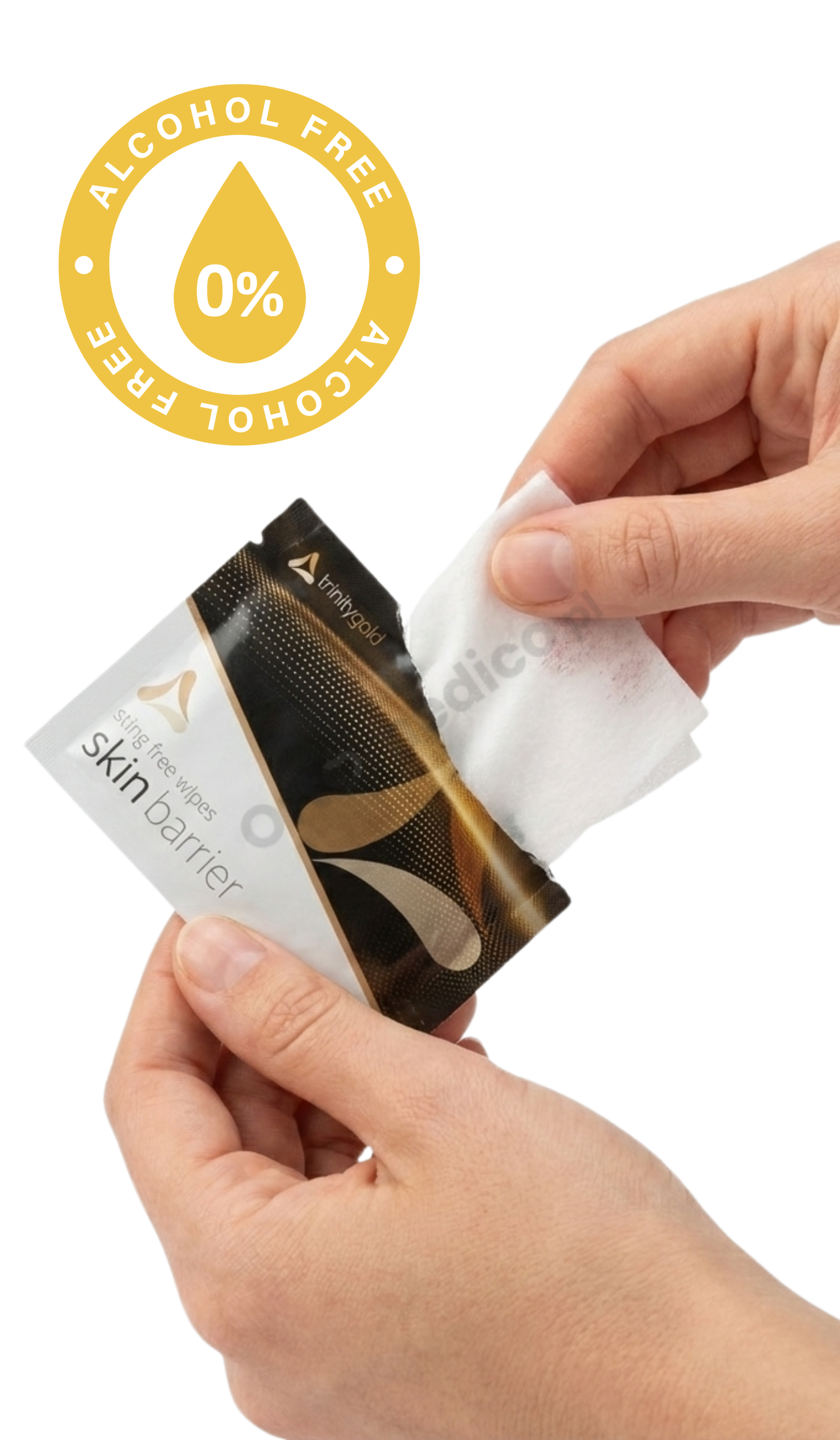 Dzięki zastosowaniu nowoczesnej technologii silikonowej Trinity Sting Free Skin Barrier zapewnia skuteczną ochronę skóry bez uczucia dyskomfortu. Bezalkoholowa i hipoalergiczna formuła sprawia, że chusteczka: