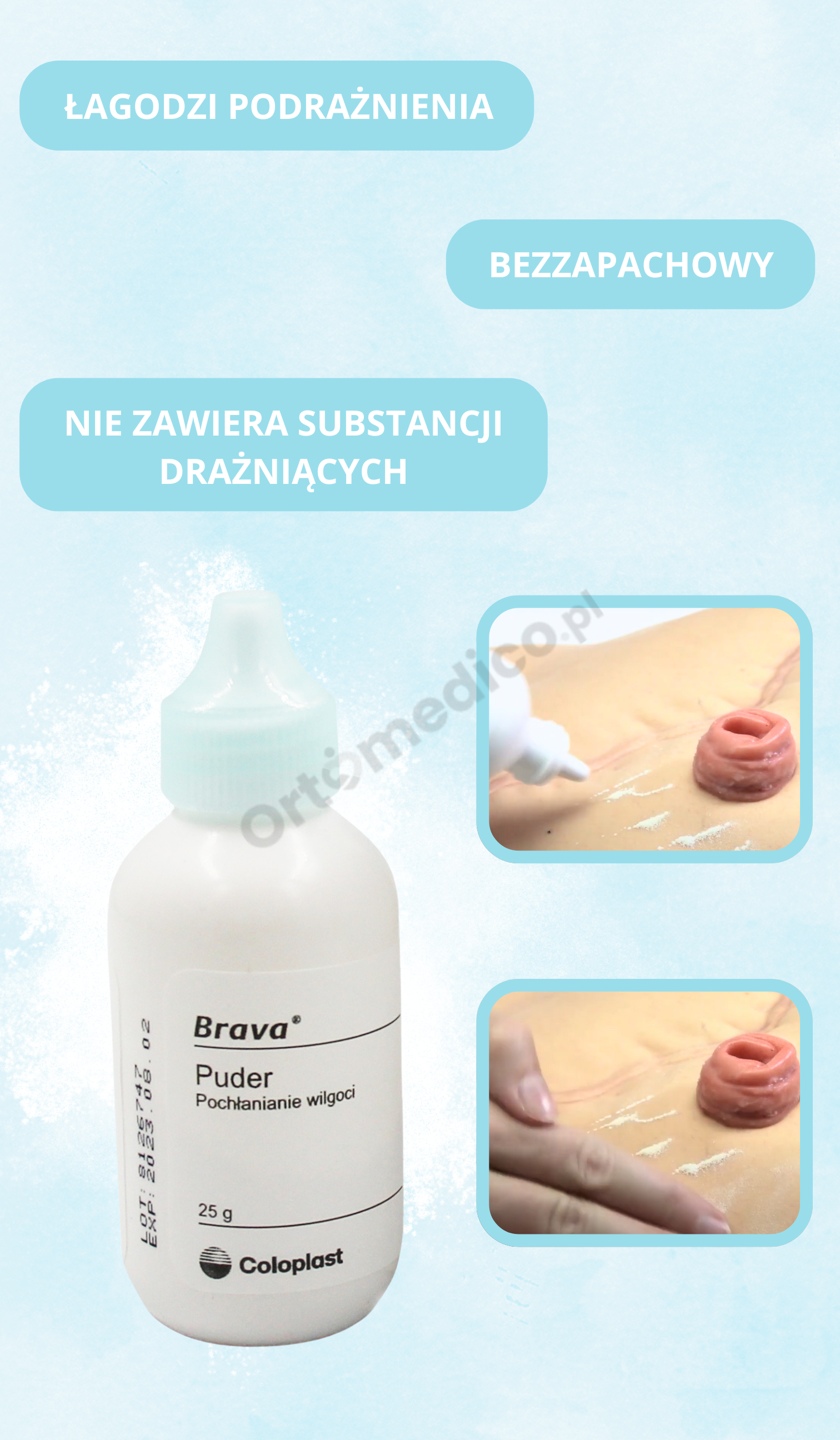 Puder Brava® działa jak naturalna tarcza — absorbuje nadmiar wilgoci gromadzącej się wokół stomii i pod przylepcem.