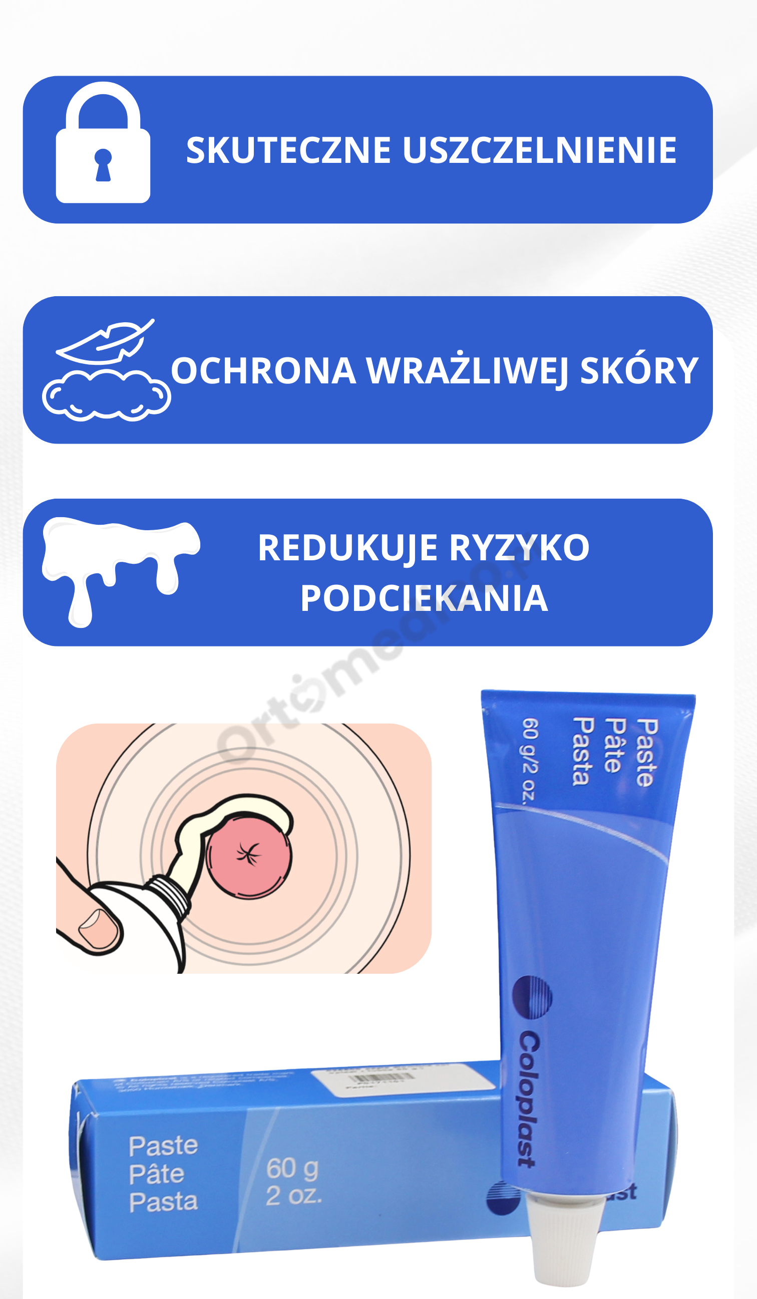 Pasta pochłania nadmiar wilgoci i tworzy barierę ochronną, dzięki czemu okolice stomii pozostają w dobrej kondycji.