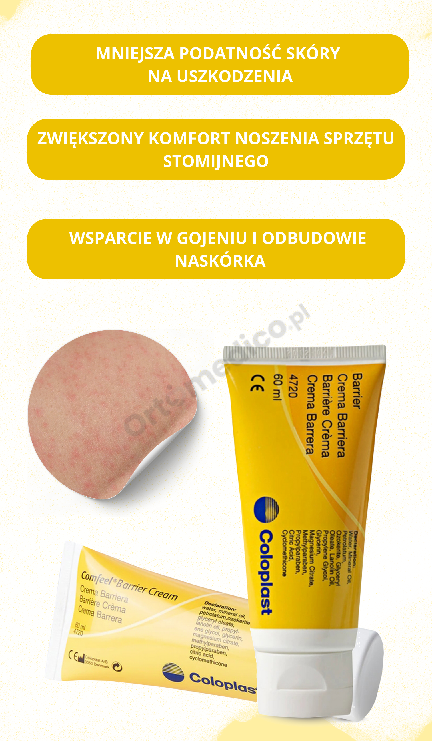 Krem nie wpływa negatywnie na przyczepność sprzętu stomijnego – po jego wchłonięciu można bez obaw założyć płytkę stomijną lub worek, mając pewność, że będą dobrze przylegać do skóry.