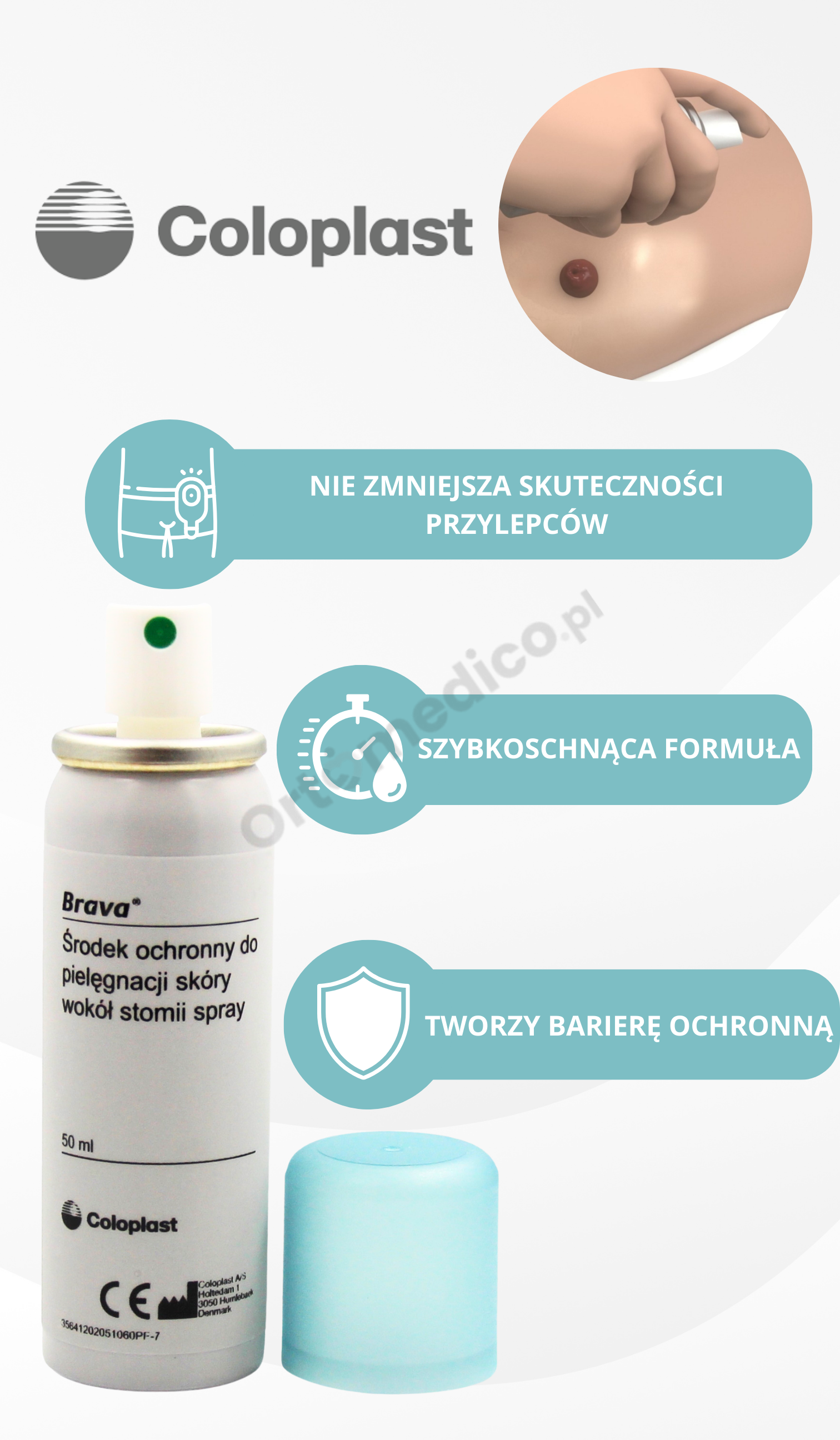 Łatwość użycia – wystarczy rozpylić cienką warstwę sprayu na oczyszczoną, suchą skórę wokół stomii, odczekać kilka sekund i przystąpić do aplikacji sprzętu stomijnego.