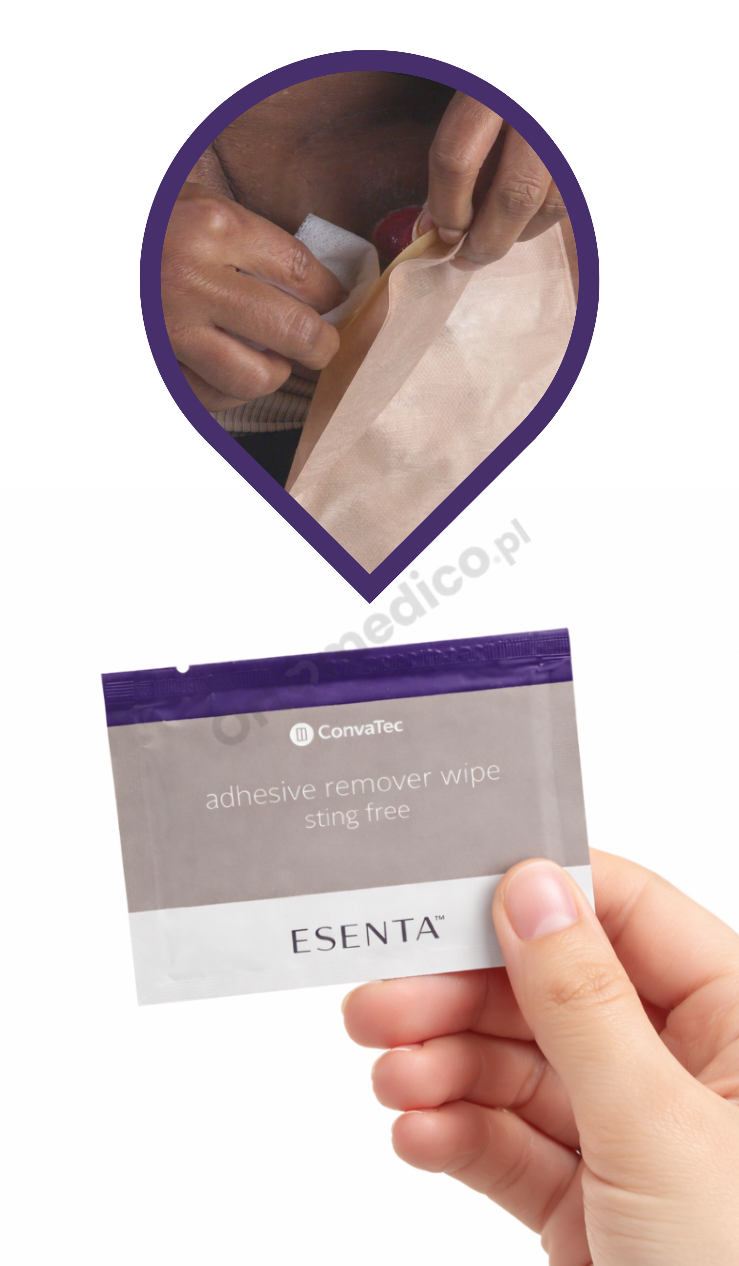 Po przetarciu skóry chusteczką ESENTA™ silikon aktywny wnika pomiędzy przylepiec a powierzchnię skóry, osłabiając jego przyczepność. Pozwala to na łatwe i kontrolowane usunięcie sprzętu stomijnego, plastra lub opatrunku bez bólu i bez ciągnięcia skóry.