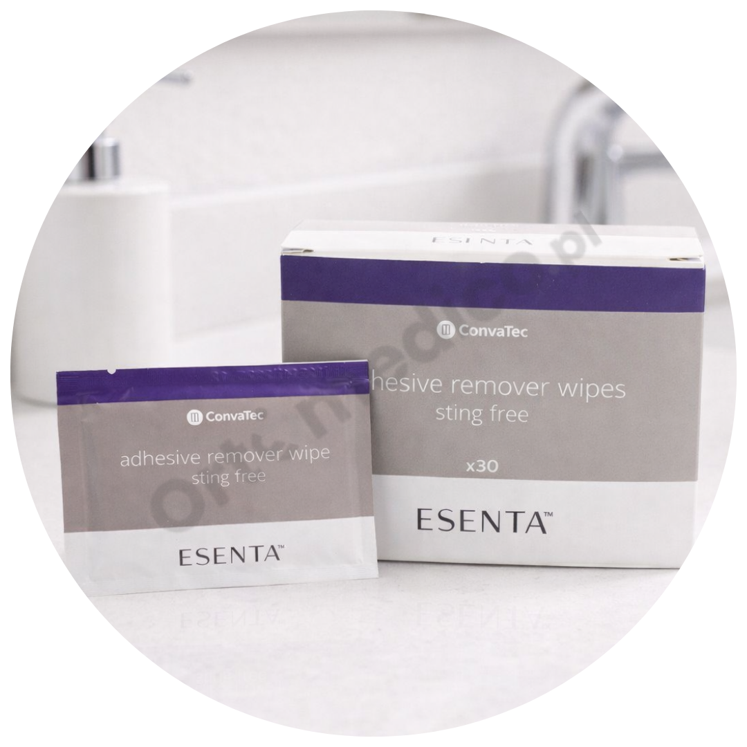 ESENTA™ Adhesive Remover - pojedyncza chusteczka to profesjonalny preparat silikonowy przeznaczony do bezbolesnego usuwania przylepca ze sprzętu stomijnego, plastrów, opatrunków oraz sensorów. Produkt polecany jest osobom ze stomią oraz użytkownikom wyrobów samoprzylepnych, którzy potrzebują skutecznego i bezpiecznego rozwiązania w kompaktowej, jednorazowej formie.