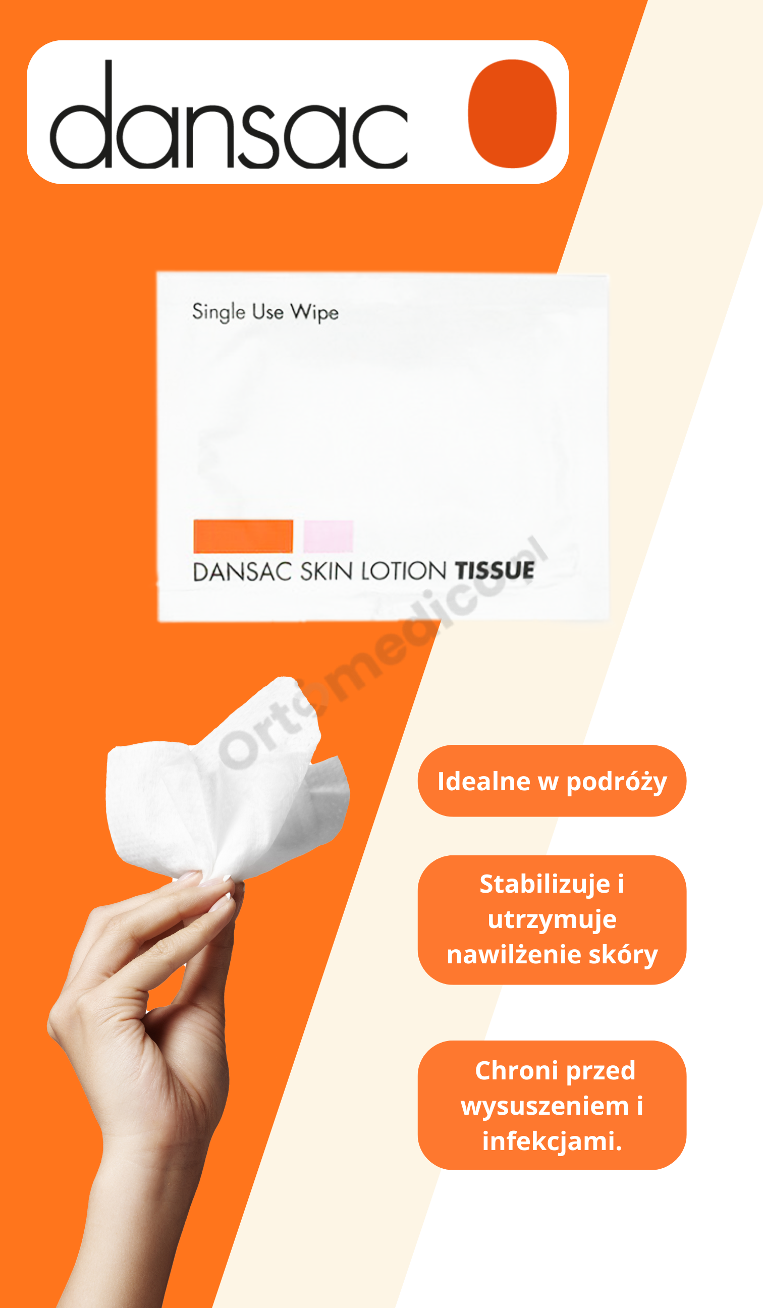 Chusteczki DANSAC Skin Lotion Tissue to praktyczne i skuteczne rozwiązanie dla osób z wyłonioną stomią, które potrzebują niezawodnej pielęgnacji skóry każdego dnia. Nasączone specjalnym płynem z dodatkiem oleju lnianego, delikatnie oczyszczają i wspierają regenerację naskórka, chroniąc przed podrażnieniami oraz wspomagając zachowanie naturalnej równowagi skóry.