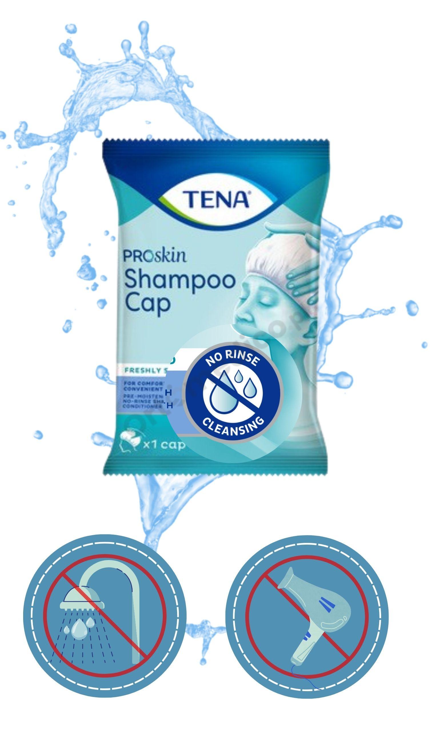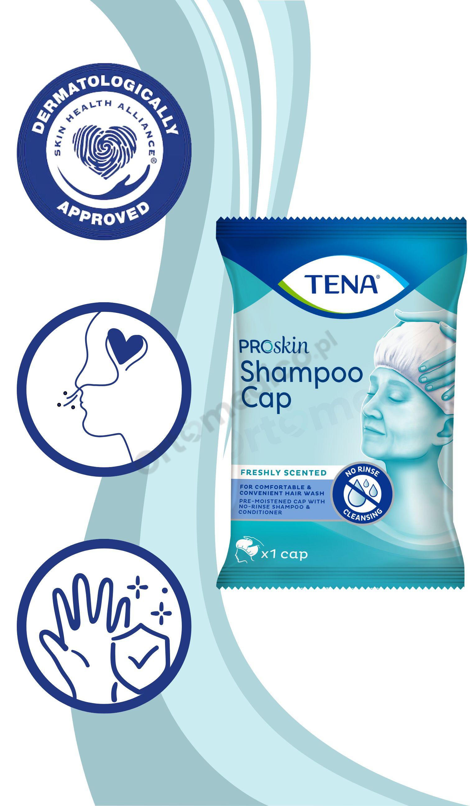 TENA ProSkin Shampoo Cap nie tylko myje włosy, ale także pielęgnuje je dzięki zawartości odżywki. Miękkie, elastyczne i wygodne w dotyku, świeży zapach zapewnia czystość i przyjemny zapach.