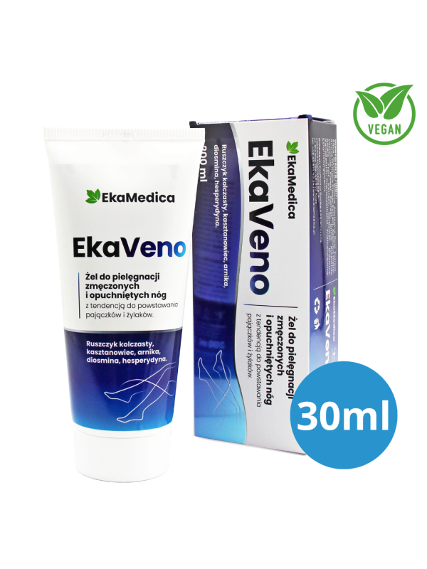 EkaVeno to żel stworzony dla osób, które chcą zadbać o komfort i wygląd swoich nóg na co dzień. Łączy w sobie ekstrakt z ruszczyka kolczastego, kasztanowca, arniki, diosminę oraz ekstrakt z gorzkiej pomarańczy standaryzowany na hesperydynę. Dzięki tej kombinacji koi zmęczone nogi, zmniejsza uczucie ciężkości i dba o skórę skłonną do powstawania pajączków i obrzęków.