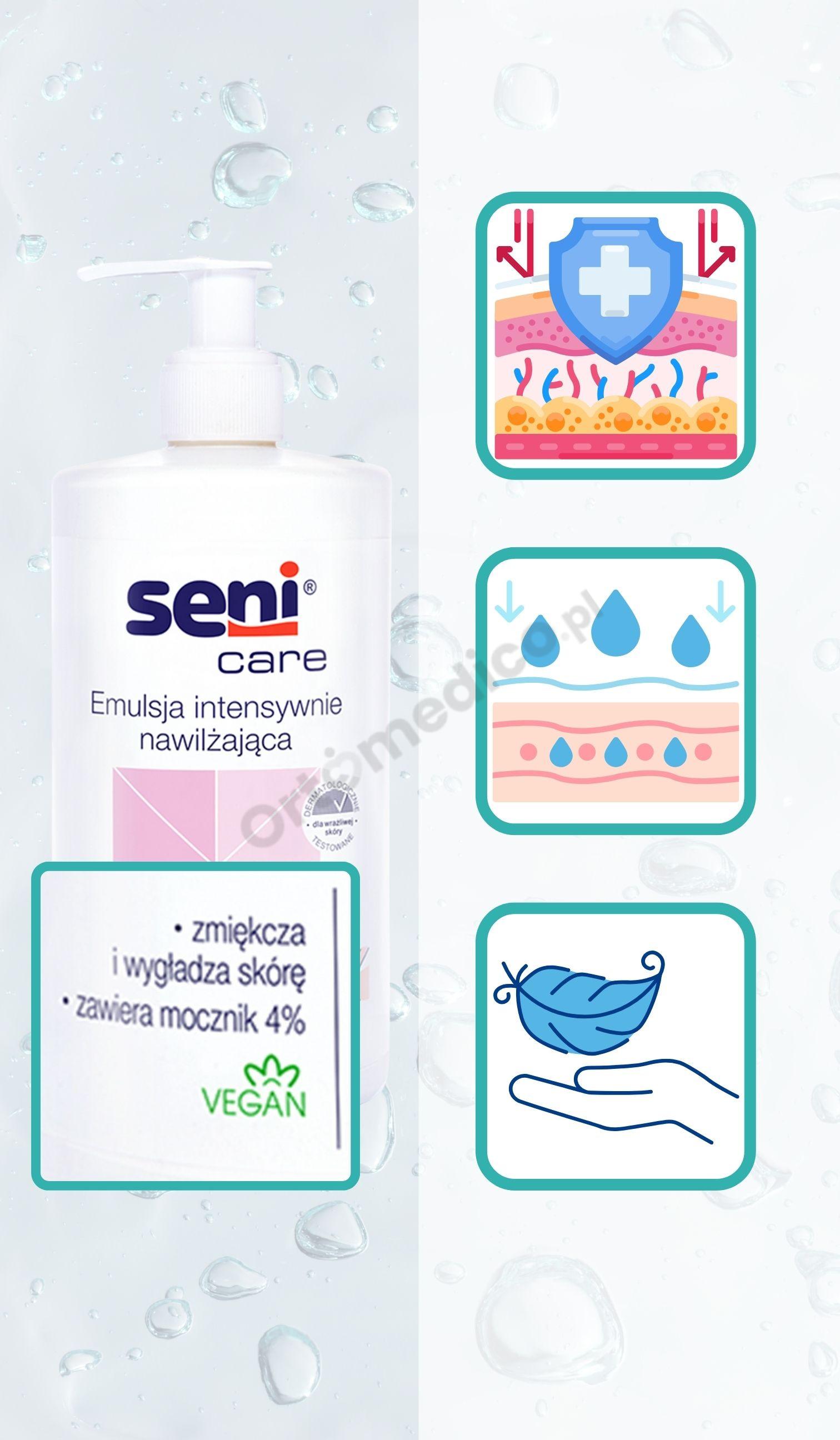 Emulsja nawilżająca Seni Care to doskonałe rozwiązanie dla osób starszych, leżących oraz u tych, u których pojawiają się oznaki odwodnienia, popękania lub skrajnego przesuszania skóry. Produkt skutecznie nawilża i ujędrnia.