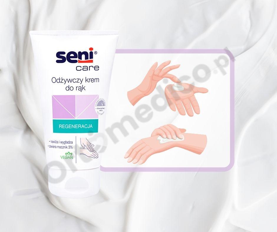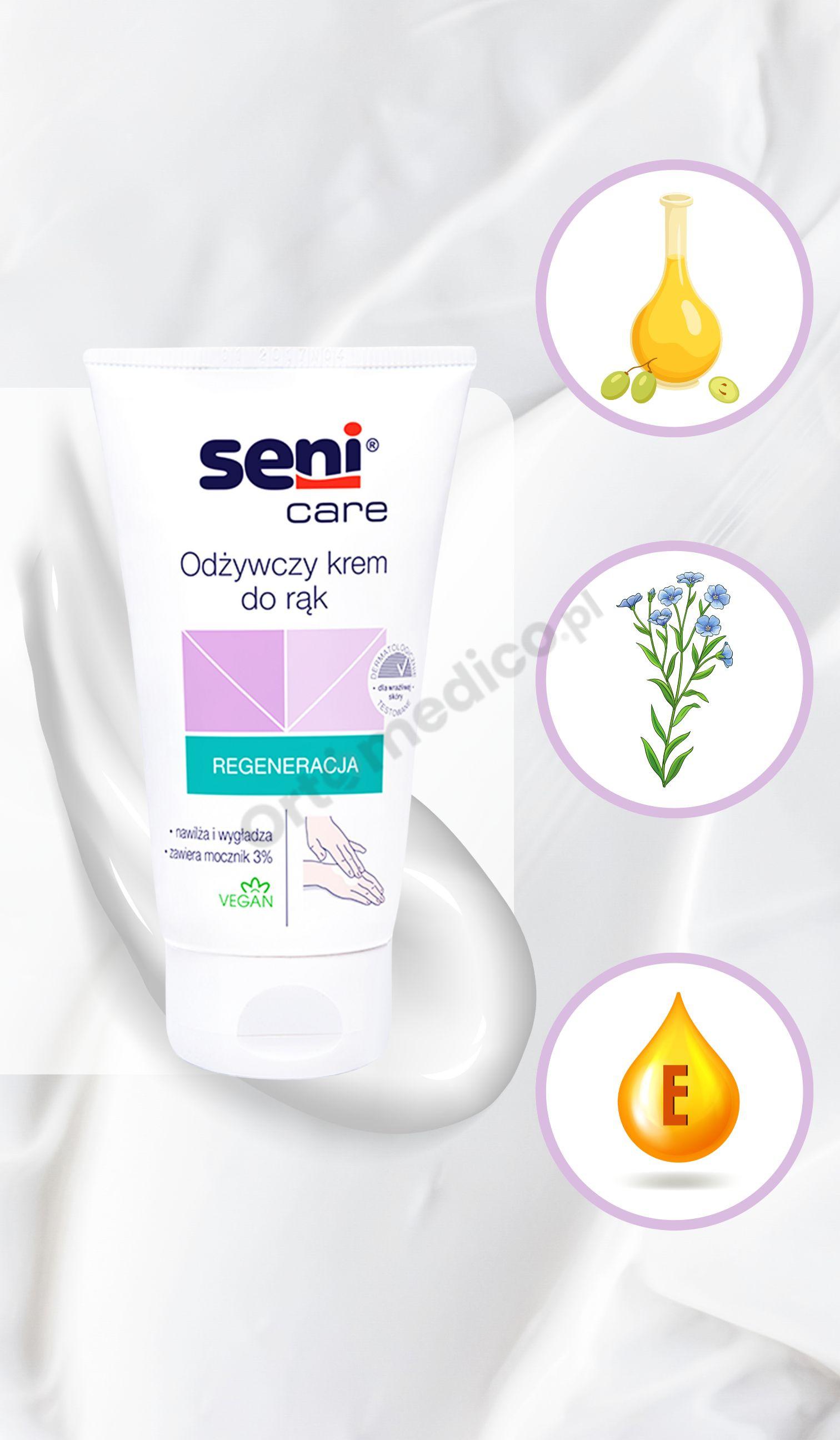 Zadbaj o swoje dłonie z Seni Care – odżywczym kremem, który skutecznie zmiękcza, wygładza i ujędrnia suchą oraz delikatną skórę dłoni. Zalecane do regularnego stosowania, szczególnie dla osób narażonych na częste kontakty z detergentami lub regularnie myjące i odkażają ręce.