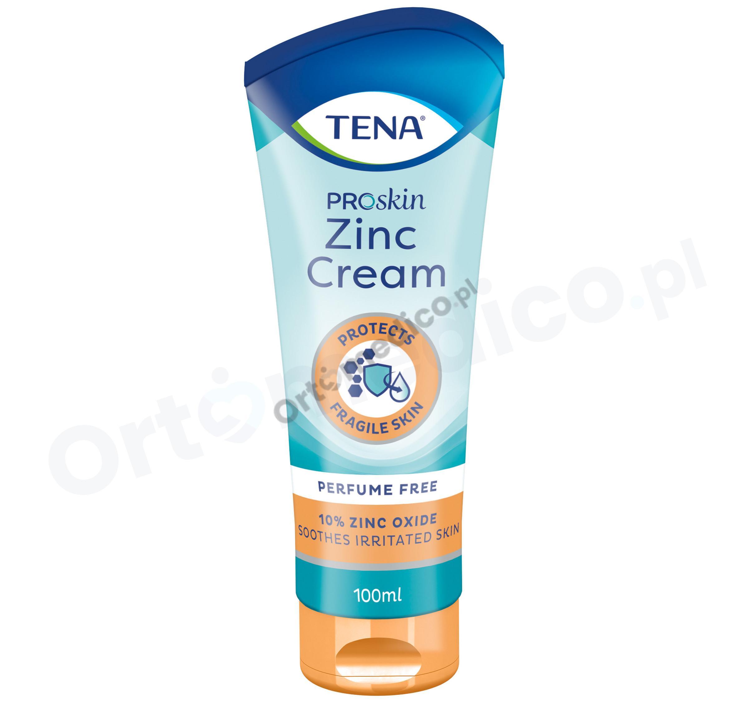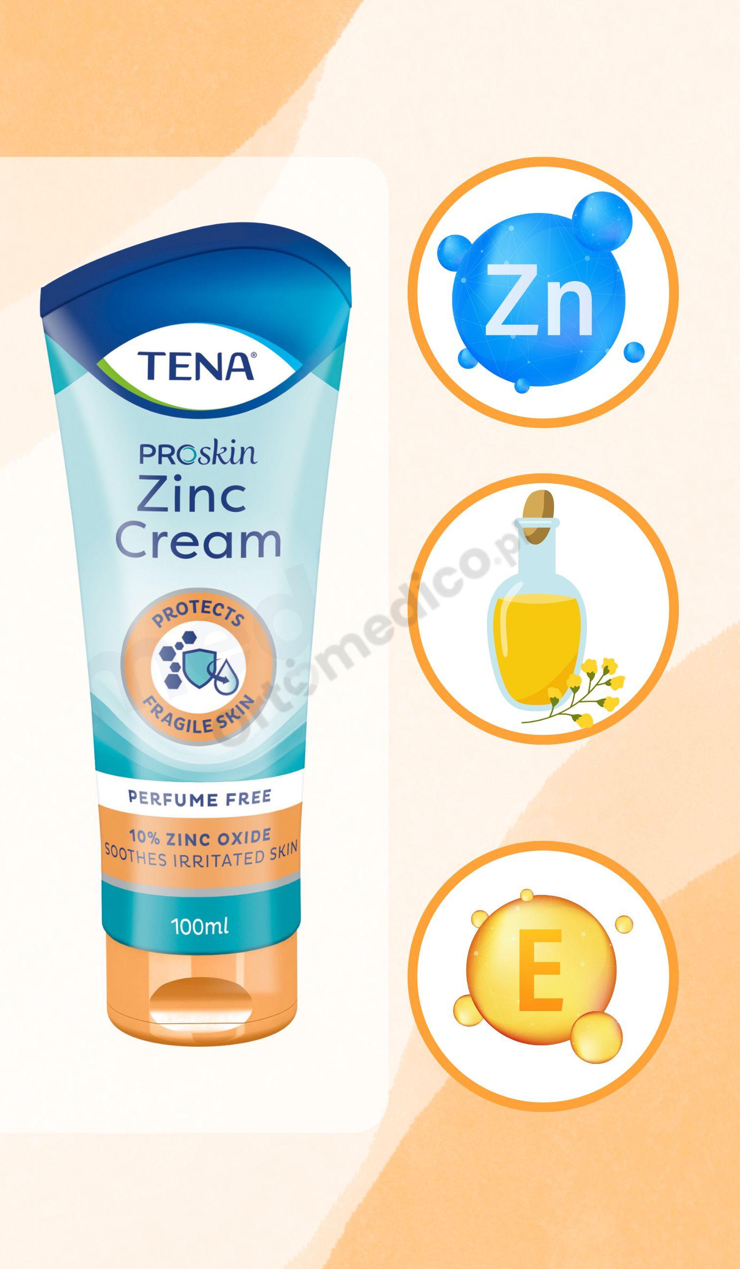 TENA Zinc Cream ProSkin to krem ​​ochronny, stworzony z myślą o podrażnionej i wysuszonej skórze, szczególnie u osób starszych. Zawiera 10% tlenku cynku, olej canola oraz witaminę E, które zawierają substancje łagodzące, nawilżające baterie hydrolipidową, które wspierają jej działanie.