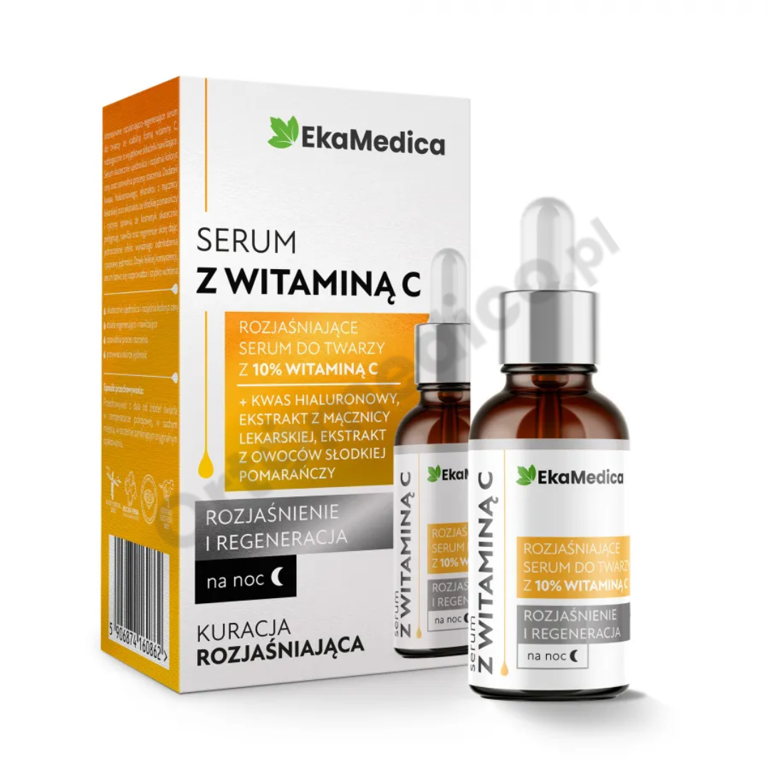 Serum z witaminą C EkaMedica to intensywnie działające serum rozjaśniająco-regenerujące, stworzone z myślą o cerze wymagającej ujednolicenia kolorytu, redukcji przebarwień oraz wsparcia w walce ze starzeniem. Formuła bazuje na stabilnej formie witaminy C, która skutecznie rozświetla skórę, przywraca jej zdrowy blask i poprawia elastyczność. Produkt doskonale sprawdza się w pielęgnacji skóry pozbawionej energii, matowej oraz o nierównomiernym kolorycie.