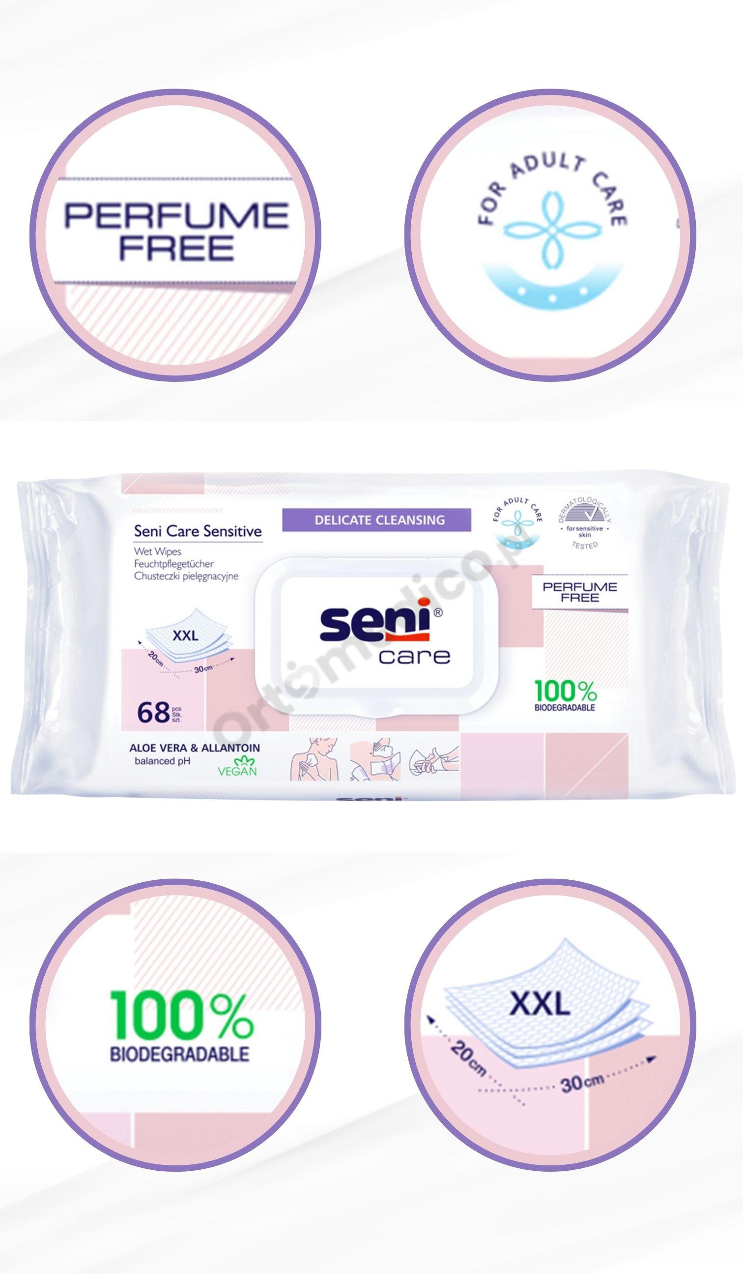 Chusteczki Seni Care Sensitive polecane są dla osób z problemem nietrzymania moczu oraz dla osób z wrażliwą i wymagającą skórą, chusteczki te zapewniają komfort, higienę i zabezpieczenie w każdej sytuacji, bez konieczności stosowania wody lub mydła. Dzięki zastosowaniu składników aktywnych oraz przyjaznej formule, chusteczki skutecznie oczyszczają, łagodzą skórę i wspierają odprowadzanie wilgoci, pozostawiają skórę nawilżoną i elastyczną.