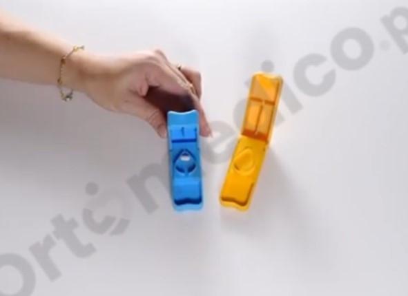 Ułóż tabletkę w ukształtowanym gnieździe na dolnej części przecinarki możliwie centralnie, maksymalnie dosuwając ją w najwęższy punkt. Zamknij przecinarkę, dbając jednocześnie o to aby tabletka nie przesunęła się z pozycji centralnej. Znajdujące się tam ostrze przetnie tabletkę na dwie części. Jeżeli po przecięciu jedna z części tabletki nie będzie od razu zażywana, możesz przechowywać ją w przegródce znajdującej się w przecinarce.