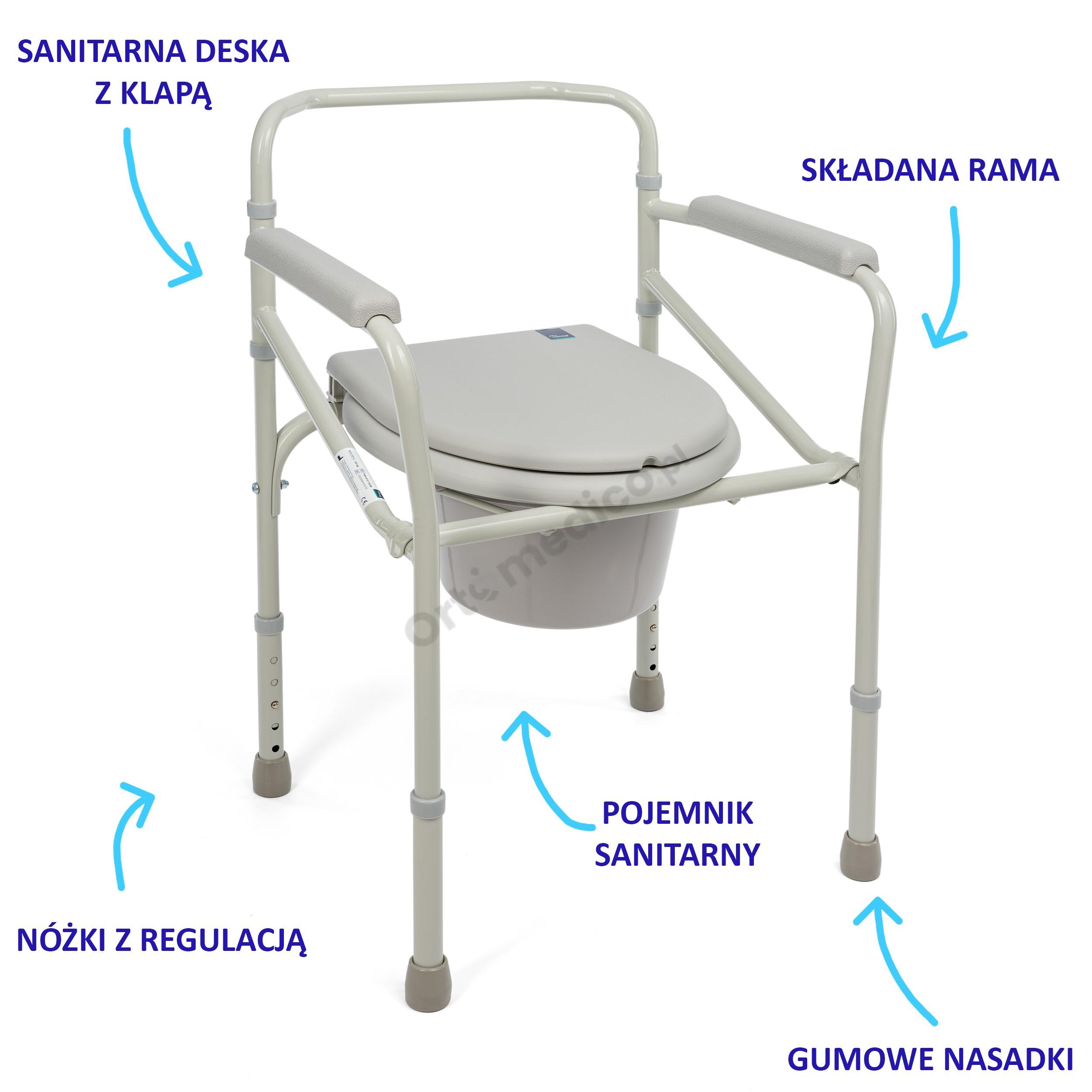Wyposażone w pojemnik sanitarny umieszczony pod siedziskiem, krzesło ułatwia pielęgnację i codzienne czynności higieniczne, eliminując potrzebę przemieszczania się do łazienki. Składana stalowa rama oraz regulowane nóżki pozwalają na dostosowanie wysokości krzesła do indywidualnych potrzeb użytkownika, a antypoślizgowe gumowe nakładki zapewniają bezpieczeństwo.