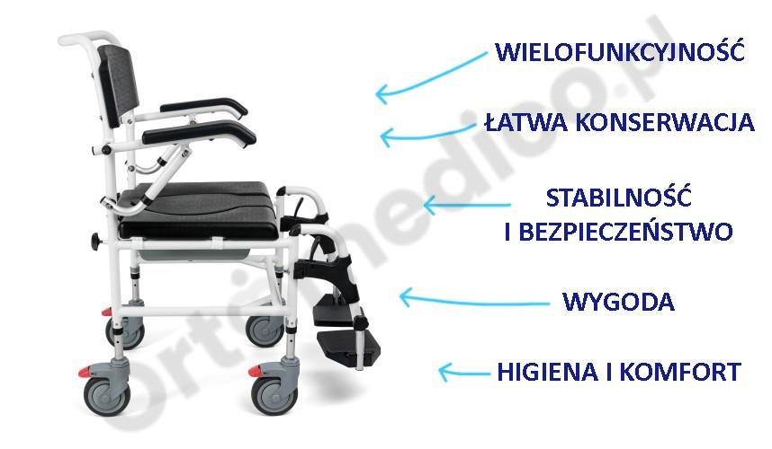 Wielofunkcyjność – umożliwia korzystanie jako wózek prysznicowy, toaletowy oraz transportowy.