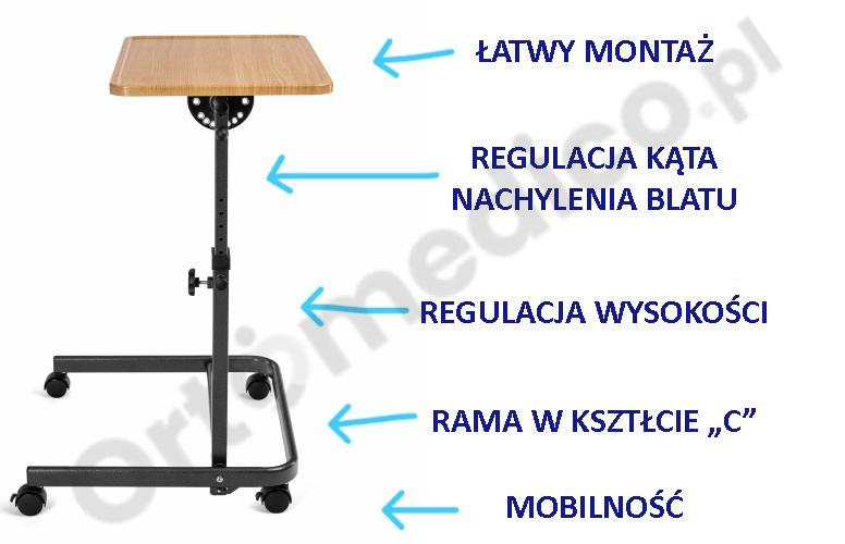 umożliwia łatwe wsunięcie stolika pod łóżko i dopasowanie go do pozycji pacjenta.