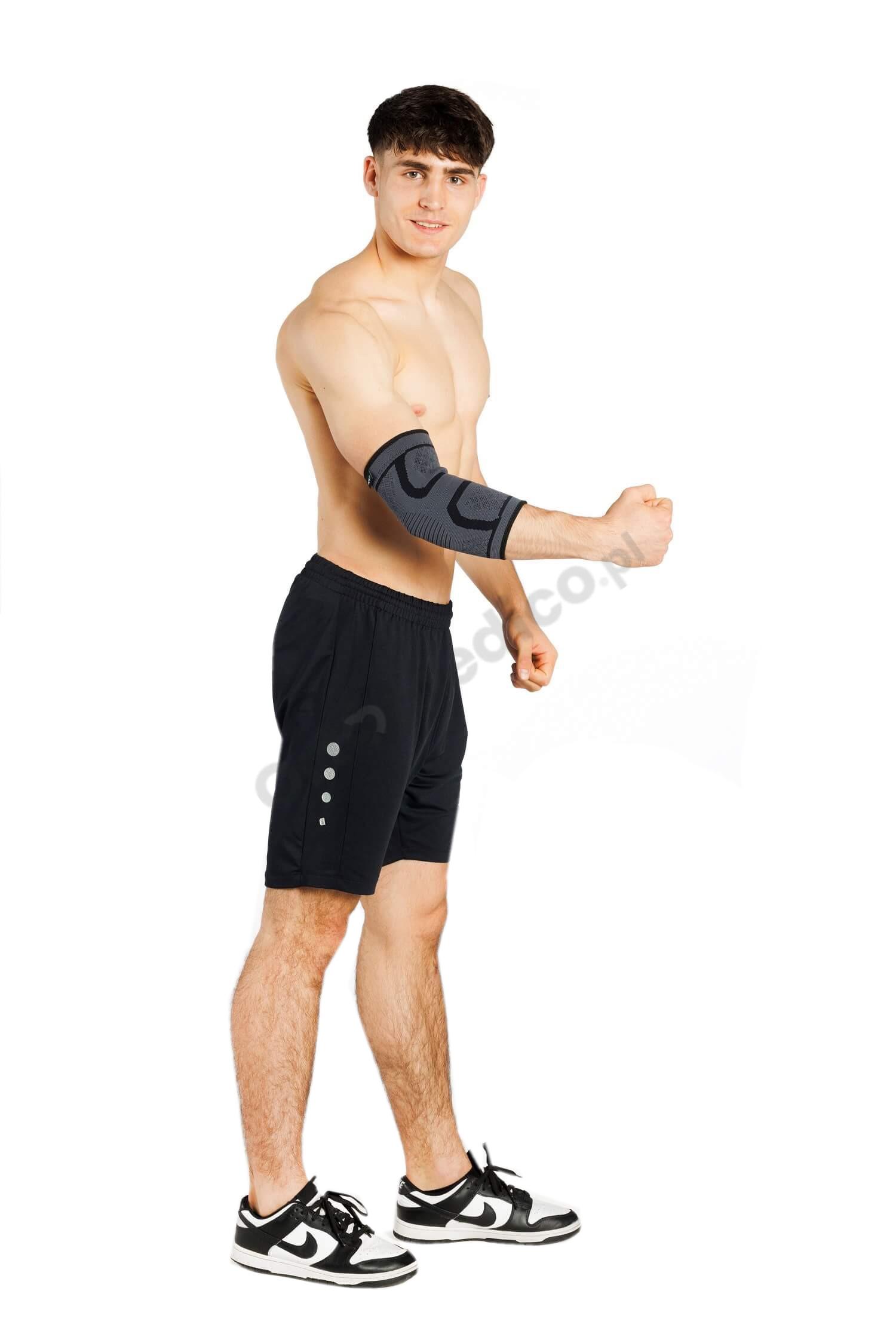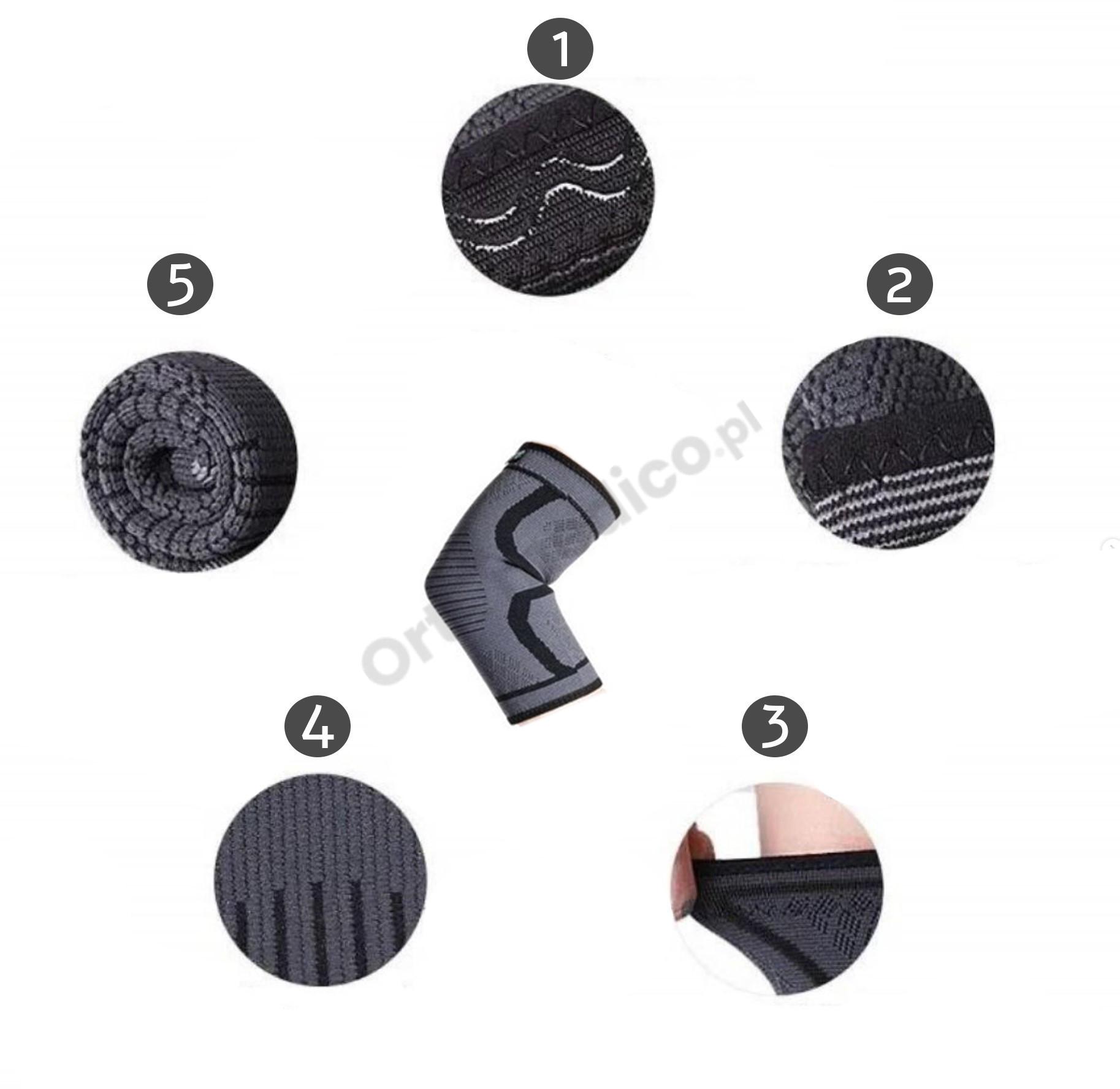 - Elastyczny materiał - dopasowuje się do kształtów łokcia, dzięki elastyczności i rozciągliwości.
