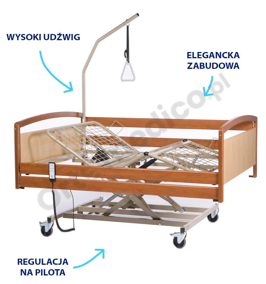 Całość zabudowy łóżka wykonana jest z płyty i drewna w eleganckiej dwukolorowej tonacji, co sprawia, że łóżko świetnie prezentuje się w domowym otoczeniu i nie przypomina typowych łóżek szpitalnych. Standardowe wyposażenie obejmuje wysięgnik i barierki, które dodatkowo zwiększają bezpieczeństwo użytkownika. Leże wykonane z kształtek plastikowych jest trwałe i łatwe do utrzymania w czystości.