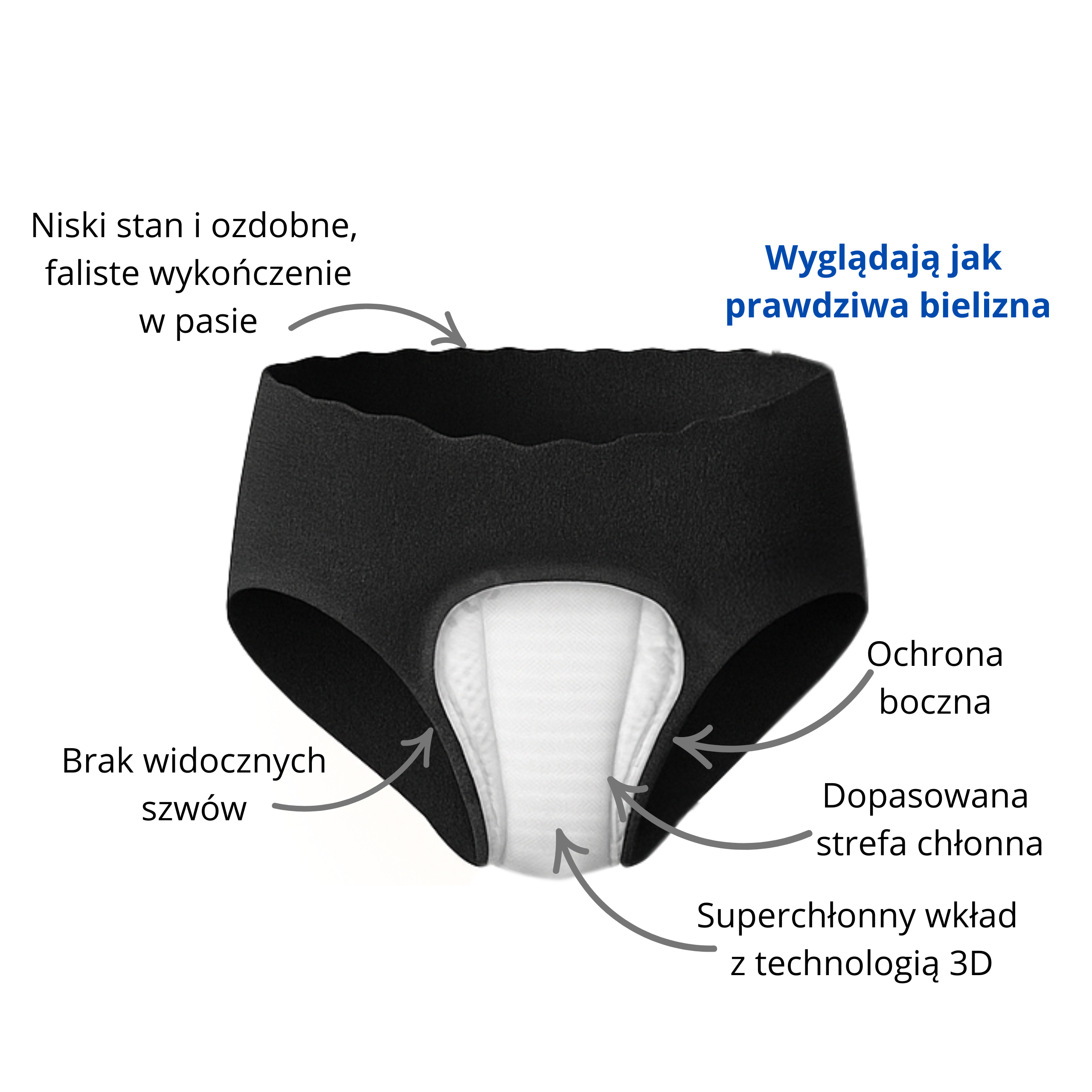 - Załóż bieliznę chłonną jak zwykłe majtki – nie wymaga dodatkowego wkładania.