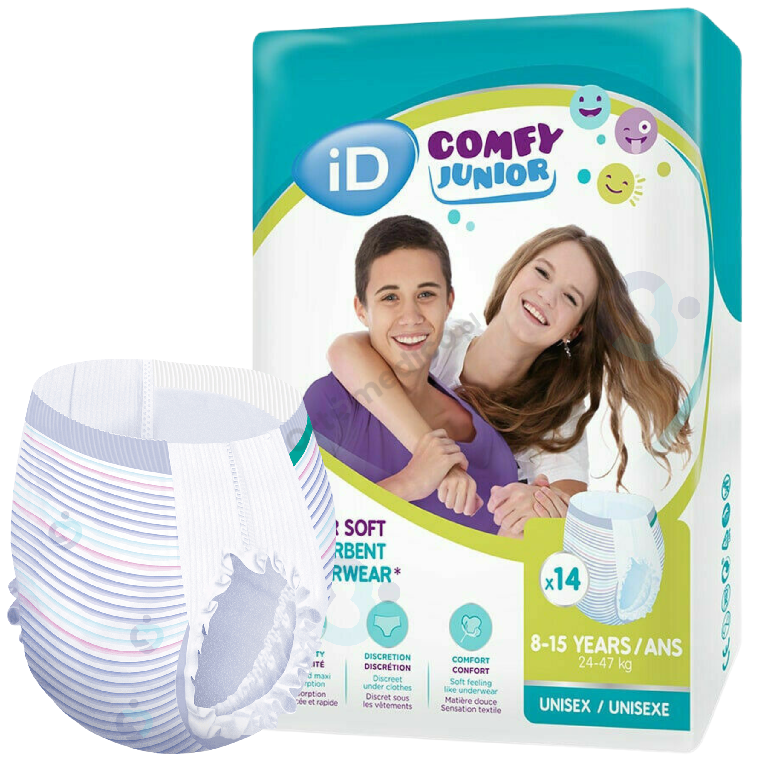 Majtki chłonne iD Comfy Junior zostały zaprojektowane z myślą o dzieciach o wadze od 24 do 47 kg, w wieku od 4 do 15 lat. Są szczególnie polecane dla dzieci i nastolatków zmagających się z nietrzymaniem moczu, które potrzebują ochrony w każdej sytuacji, bez uczucia skrępowania.