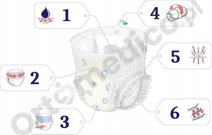 Zakładane są jak zwykłe majteczki. Wspaniałe do zabawy i snu. Ich miękki super chłonny wkład gwarantuje maksymalne wchłanianie i poczucie suchości przez wiele godzin. Wyjątkowy kształt dopasowuje się idealnie do ciała dziecka zarówno w dzień jak i w nocy.