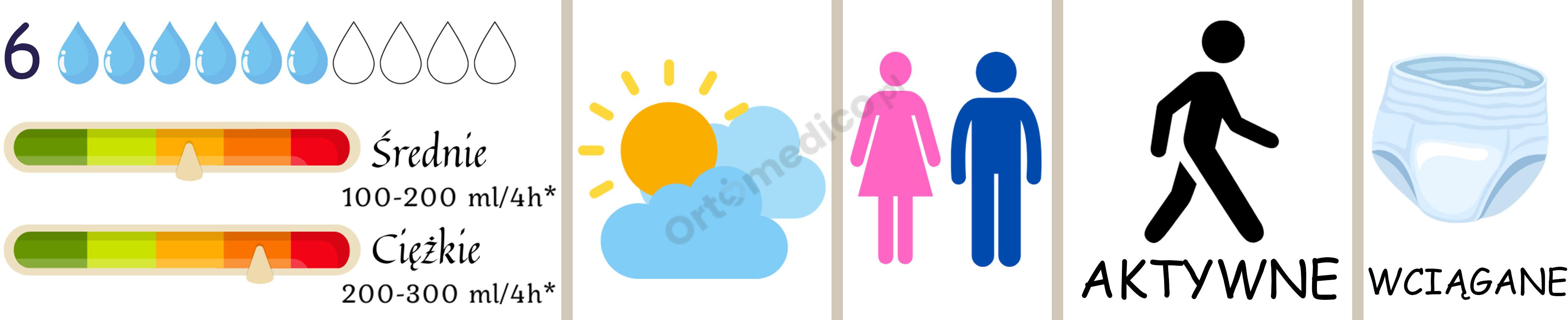 - Chłonność 6/10: Zapewnia skuteczną ochronę w przypadkach średniego i ciężkiego nietrzymania moczu, szczególnie podczas codziennych aktywności.