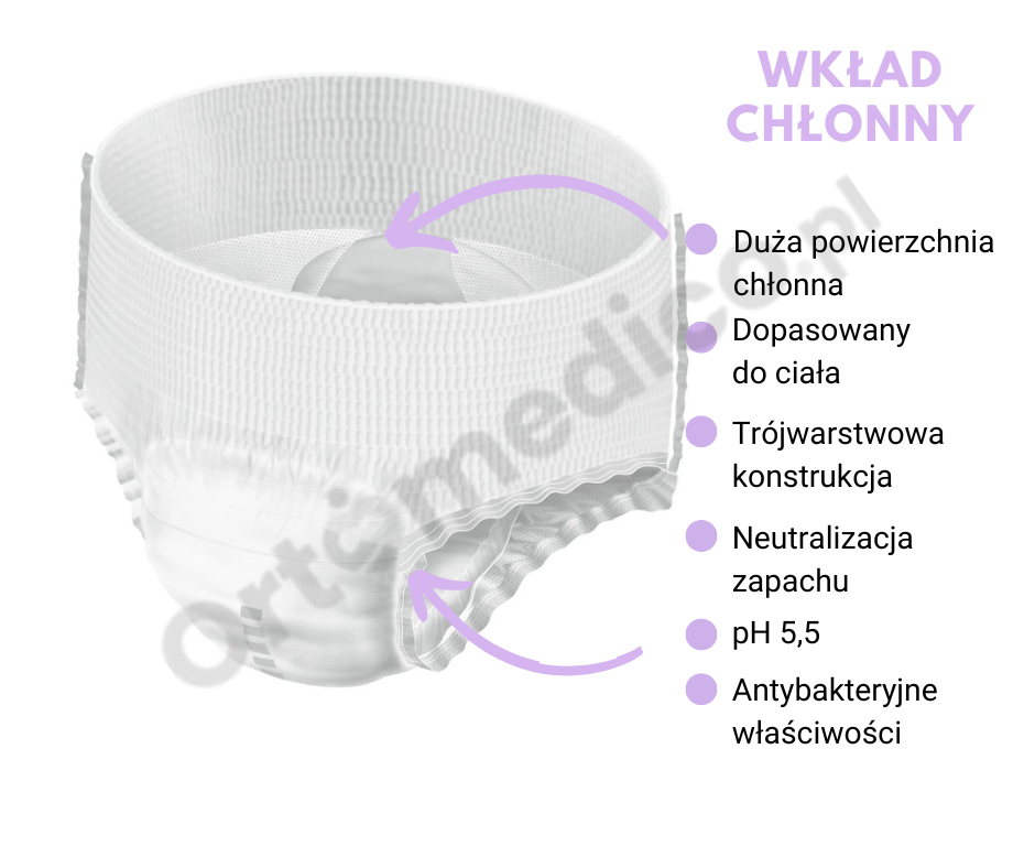 Specjalna konstrukcja trójwarstwowego wkładu chłonnego zapewnia skuteczność zarówno w ciągu dnia, jak i w nocy, co czyni go idealnym rozwiązaniem dla osób leżących i o bardzo ograniczonej mobilności.