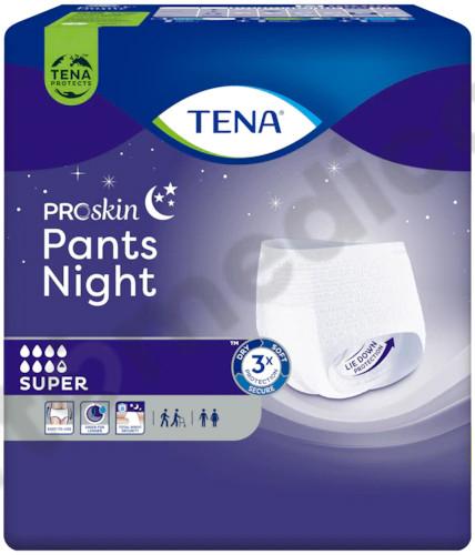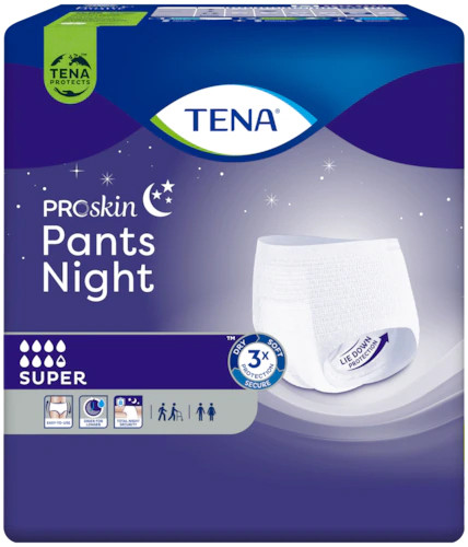 Majtki chłonne TENA Pants Super Night przeznaczone są dla osób z ciężkim i bardzo ciężkim stopniem nietrzymania moczu oraz przy inkontynencji kałowej. Zakładane są jak zwykła bielizna, przeznaczone zarówno dla osób aktywnych jak i dla tych o ograniczonej mobilności. Chłonność jaką posiadają te majtki to 7,5/8 kropelek, są przeznaczone do stosowania na noc.