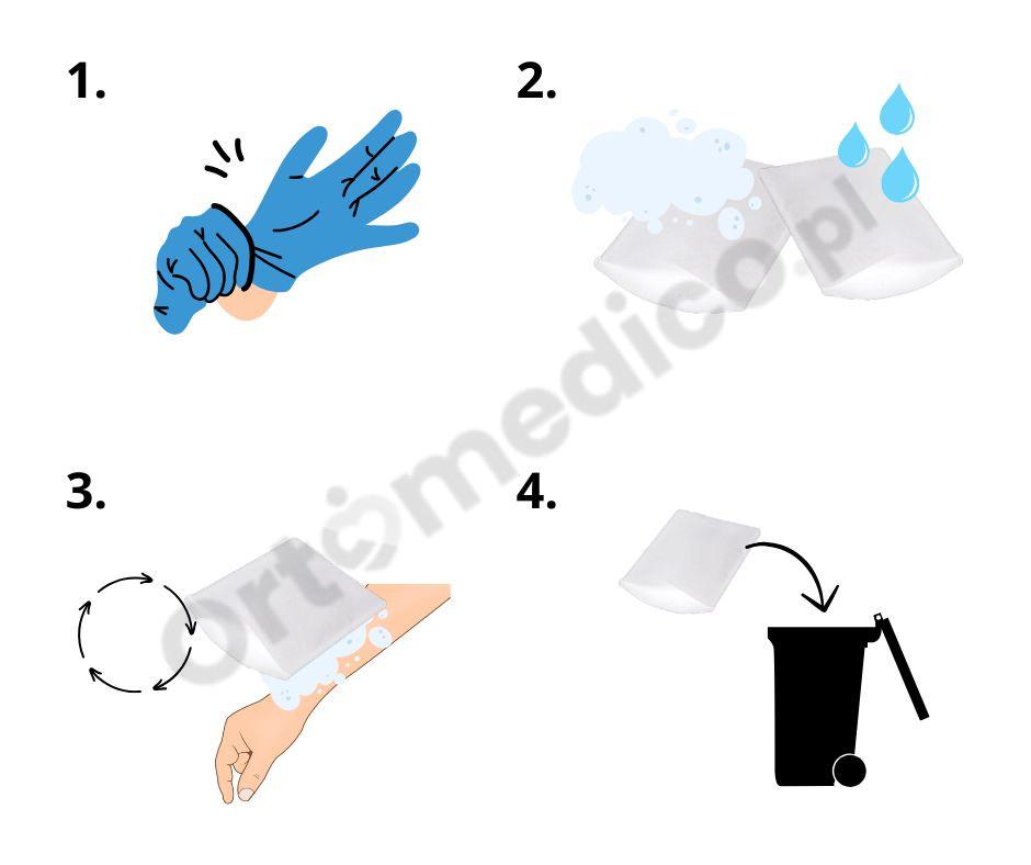 4. Utylizacja – Po zakończeniu pielęgnacji, myjkę oraz rękawiczki jednorazowe wyrzuć do kosza na odpady.