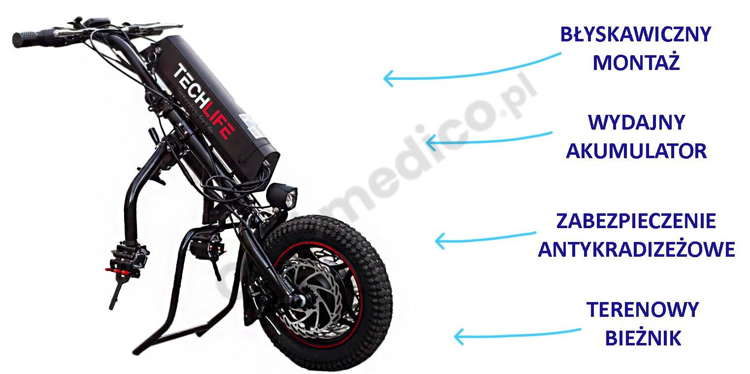napęd elektryczny do wózka inwalidzkiego Techlife W1, przystawka elektryczna do wózka manualnego, wózek elektryczny przystawka, napęd do wózka zwiększający mobilność, wózek inwalidzki elektryczny Techlife, przekształcenie wózka manualnego w elektryczny, wózek elektryczny do miasta i terenu, napęd do wózka Śląsk Rybnik
