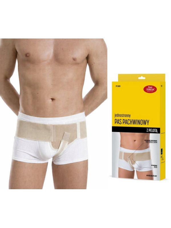 Jednostronny pas pachwinowy PT 0109 z pelotą to wyrób medyczny przeznaczony do stabilizacji i podtrzymania okolicy pachwinowej w przypadku przepukliny pachwinowej lewej lub prawej. Produkt stosowany jest zarówno profilaktycznie, jak i wspomagająco w leczeniu zachowawczym oraz po zabiegach operacyjnych. Pas wywiera kontrolowany ucisk na okolicę przepukliny za pomocą anatomicznie wyprofilowanej peloty, pomagając w jej odprowadzeniu i ograniczeniu powiększania się ubytku. Konstrukcja pasa umożliwia indywidualne dopasowanie do budowy ciała oraz wybór strony stosowania - lewej lub prawej.