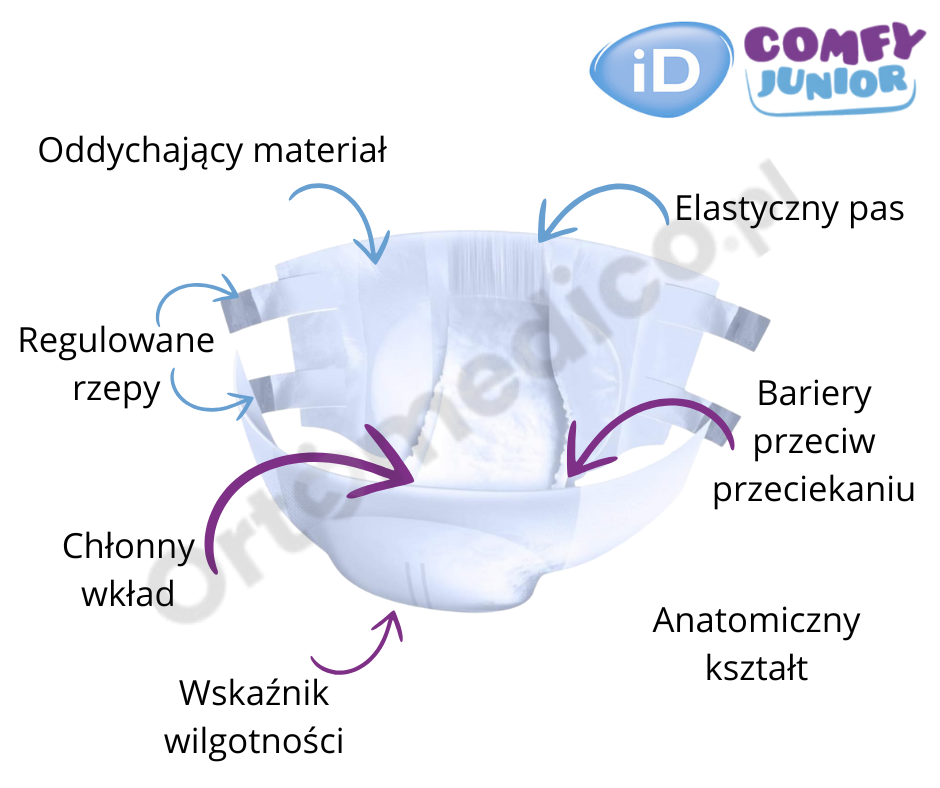 Każdy element budowy pieluchy iD Comfy Junior został opracowany, aby zapewnić dziecku maksymalny komfort, suchość i ochronę skóry. To produkt, który łączy w sobie funkcjonalność, bezpieczeństwo i wygodę – zarówno dla dziecka, jak i rodzica.