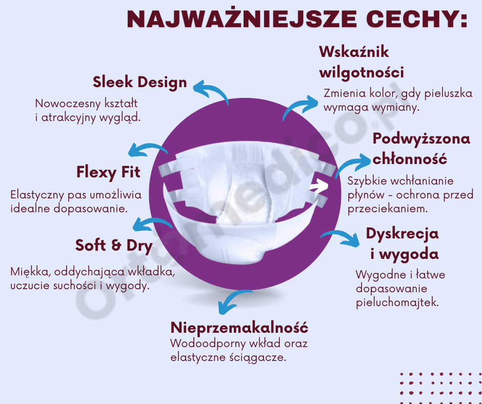 • Dyskrecja i wygoda – miękki materiał i samoprzylepne paski pozwalają na wygodne i łatwe dopasowanie pieluchomajtek.