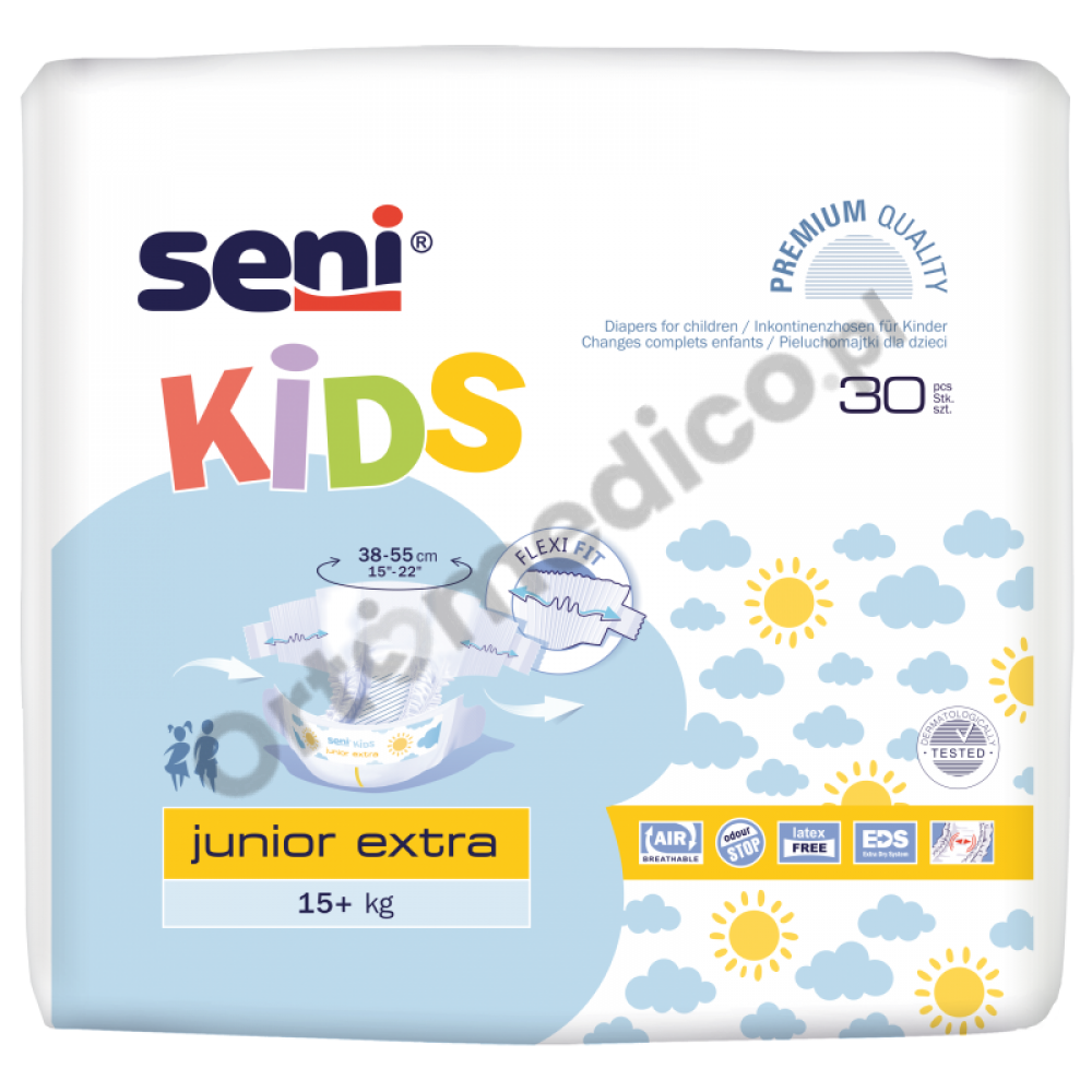 Pieluchomajtki Seni Kids to dobre i sprawdzone zabezpieczenie przeznaczone dla dzieci z nietrzymaniem moczu w stopniu średnim i ciężkim. Polecane dla dzieci, które wyrosły z tradycyjnych pieluszek. Seni Kids Junior Extra przeznaczone są dla dzieci o wadze od 15 do 30 kilogramów o obwodzie w pasie od 38 do 55 cm.