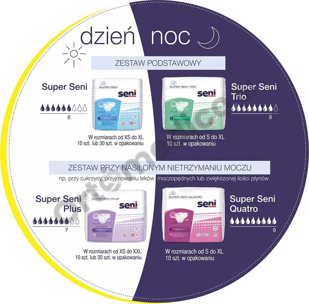 Super Seni Trio i Super Seni Quatro na noc doskonale sprawdzą się jako uzupełnienie pieluchomajtek Super Seni (6/9 kropli) oraz Super Seni Plus (7/9 kropli) o niższej chłonności stosowanych na dzień.