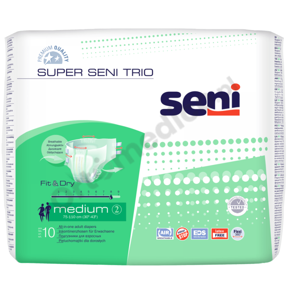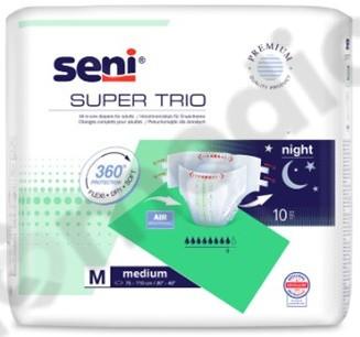 Pieluchomajtki Super Seni Trio przeznaczone są dla osób z ciężkim i bardzo ciężkim stopniem nietrzymania moczu oraz przy inkontynencji kałowej. Przeznaczone zarówno dla osób aktywnych jak i dla tych o ograniczonej mobilności. Chłonność jaką posiada ta pielucha to 8/9 kropelek, dzięki czemu idealnie nadają się również na noc.