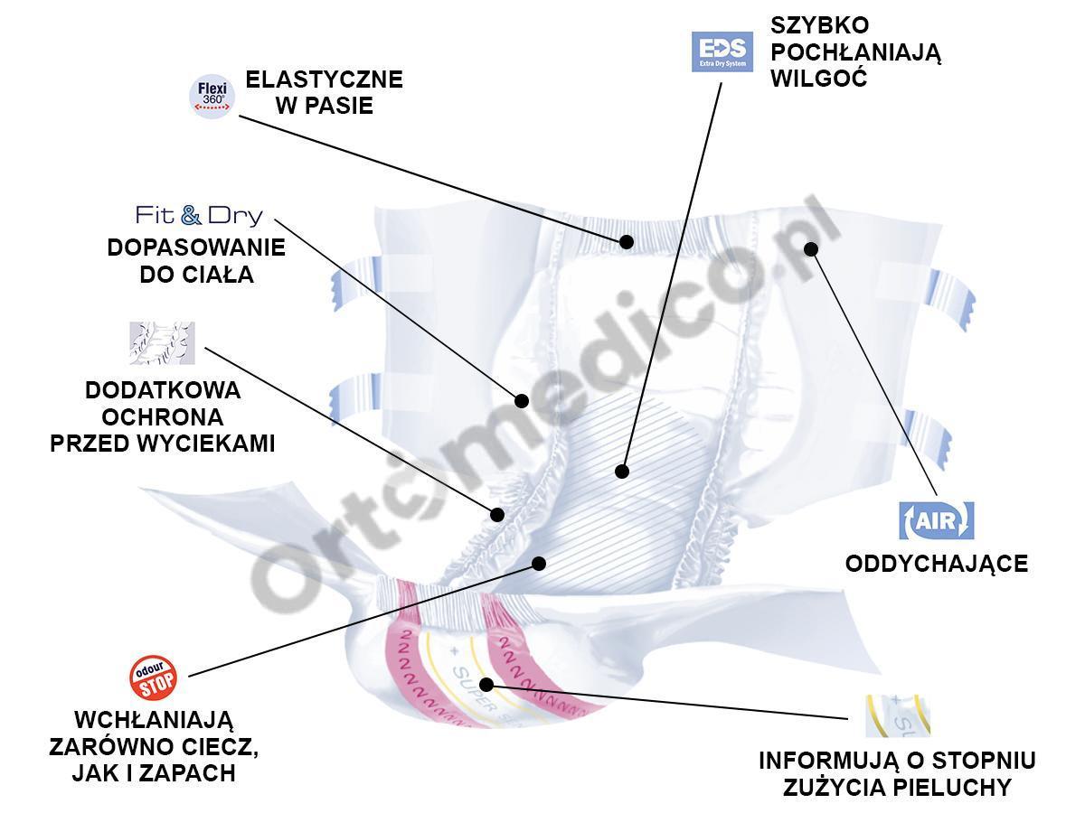 Produkty Seni, które zapewniają wysoki poziom komfortu użytkowania oraz poczucie suchości, posiadają ściągacz taliowy oraz pary elastycznych przylepcorzepów, które pozwalają na idealne dopasowanie do ciała oraz zwiększone poczucie suchości. Dzięki specjalnemu materiałowi, pieluchy dopasowują się do ciała, minimalizując ryzyko reakcji alergicznych, co jest szczególnie ważne dla osób o wrażliwej skórze. Dodatkowo, indykator wilgotności informuje o konieczności wymiany pieluchy, co zwiększa wygodę użytkowania.